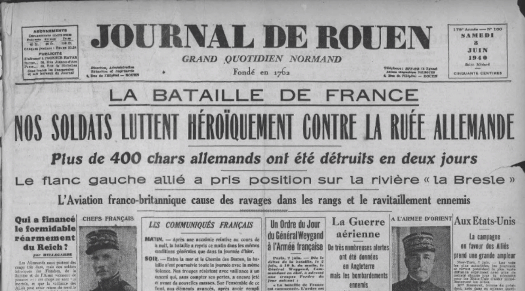 ↑Le 7 juin 1940, les troupes de la Wehrmacht, appuyées par les bombardements de la Luftwaffe, pénètrent en Normandie dans la région de Forges-les-Eaux et Gournay. Le 8 juin, elles atteignent la Seine à Pont-de-l’Arche et Château Gaillard pendant que les blindés de Rommel s’arrêtent devant Rouen. La ville est prise le lendemain, le 9 juin. Piégé dans la nasse de Saint-Valery-en-Caux, le corps expéditionnaire britannique se replie par la mer, laissant derrière lui nombre de soldats. Désormais, l’objectif se situe dans le Cotentin : prendre le port militaire de Cherbourg avant la signature de l’armistice. Malgré l’opiniâtreté d’une poignée de soldats français, la défense est rompue. Cherbourg, encerclée, se rend le 20 juin.