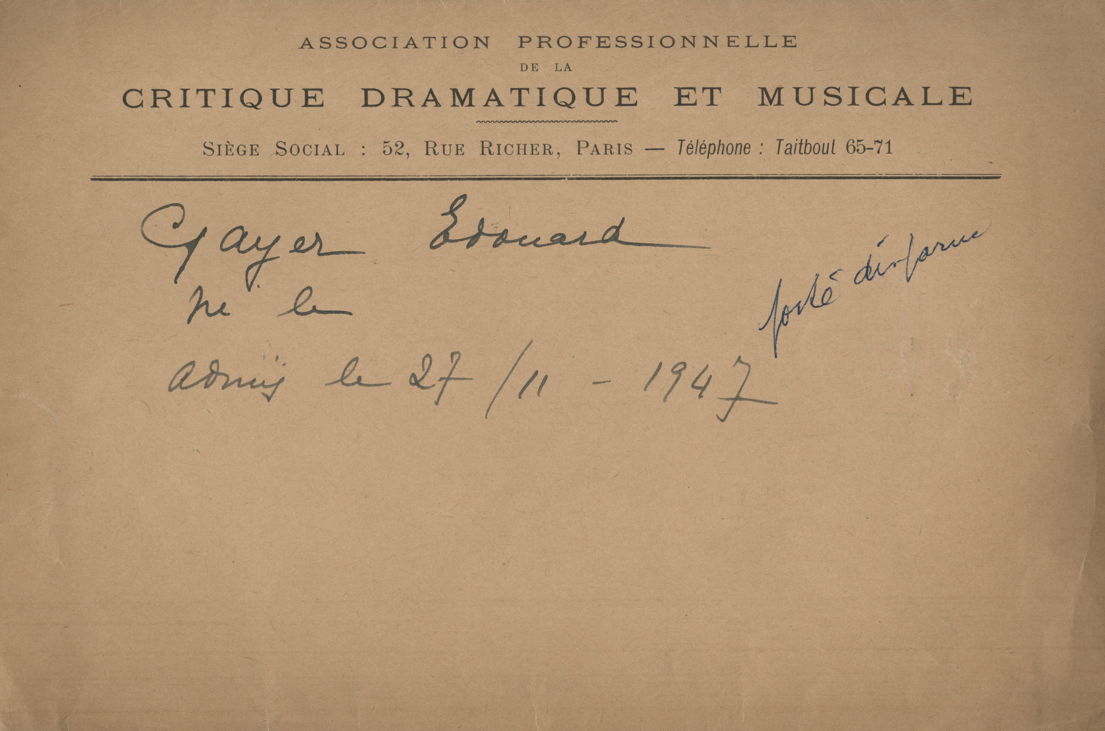 | Intitulé | Gayer, Édouard. - Date d'admission 27 novembre 1947. Parrains Léon Treich, Robert Kemp. |