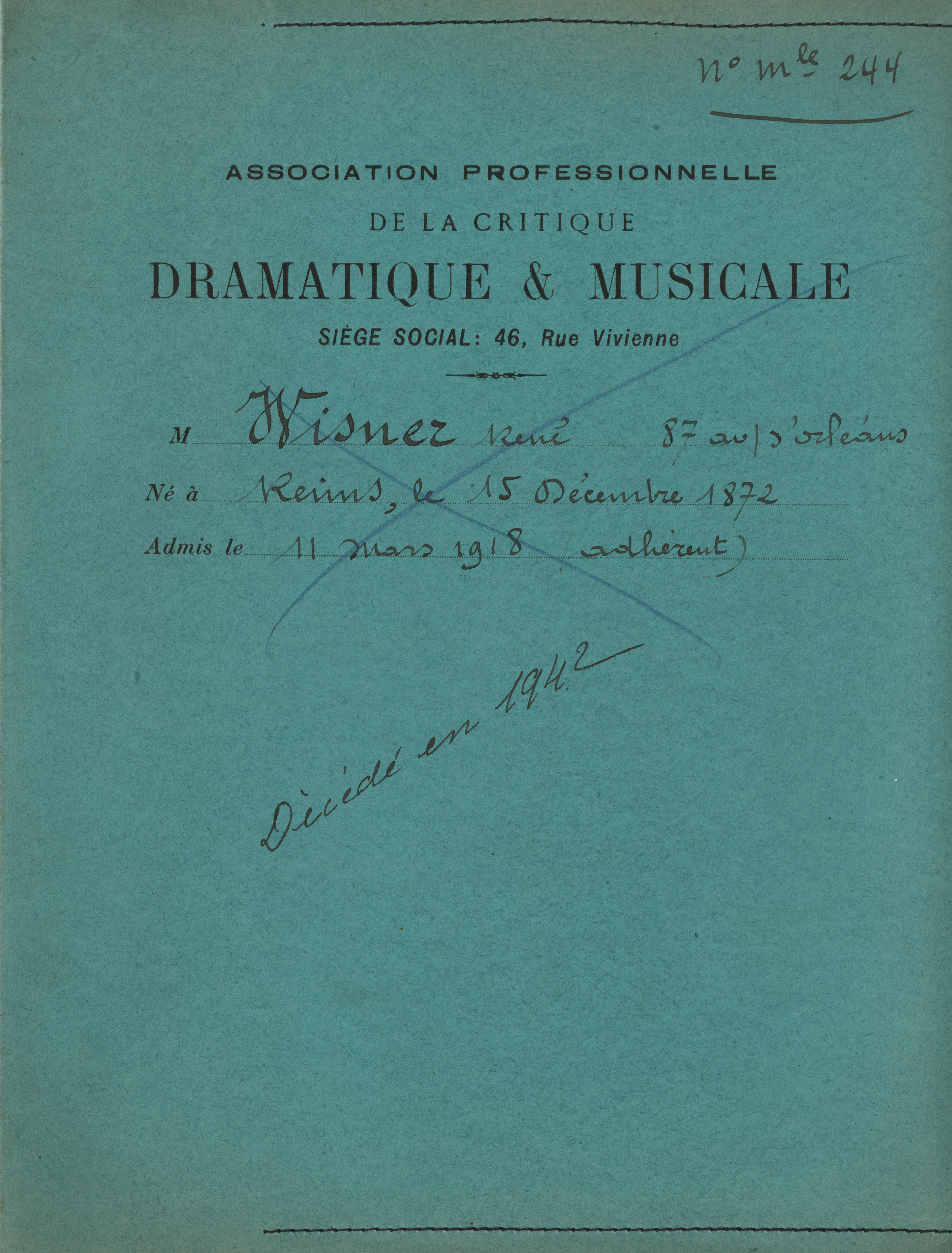 | Intitulé | Wisner, René (1872-1942). - Date d'admission 11 mars 1918. Périodiques Le Carnet de la semaine, Vogue, La France, L'Action, L'Heure. Parrains Camille Le Senne, Georges Boyer, Maurice Varret. Rapporteur Edmond Stoullig. |