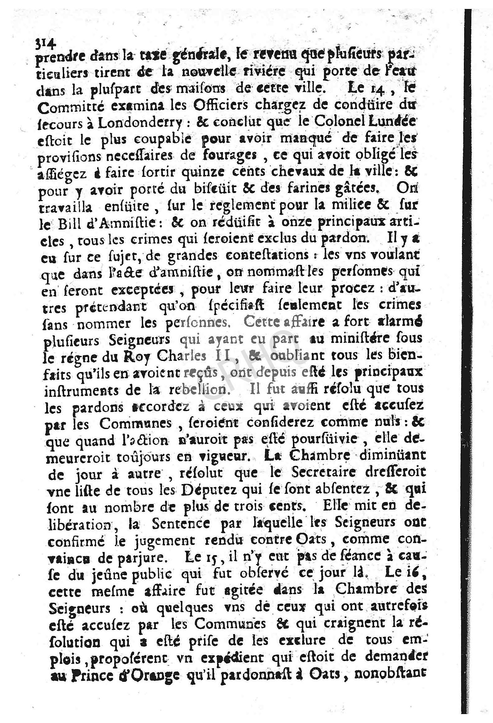 estoit le plus coupable pour avoir manqué de faire les provisions necessaires de fourages, ce qui avoit obligé les assiégez à faire sortir quinze cents chevaux de la ville : et pour y avoir porté du biscüit et des farines gâtées. On travailla ensüite, sur le reglement pour la milice et sur le Bill d’Amnistie : et on rédüisit à onze principaux articles, tous les crimes qui seroient exclus du pardon. Il y a eu sur ce sujet, de grandes contestations : les vns voulant que dans l’acte d’amnistie, on nommast les personnes qui en seront exceptées, pour leur faire leur procez : d’autres prétendant qu’on spécifiast seulement les crimes sans nommer les personnes. Cette affaire a fort alarmé plusieurs Seigneurs qui ayant eu part au ministére sous le régne du
