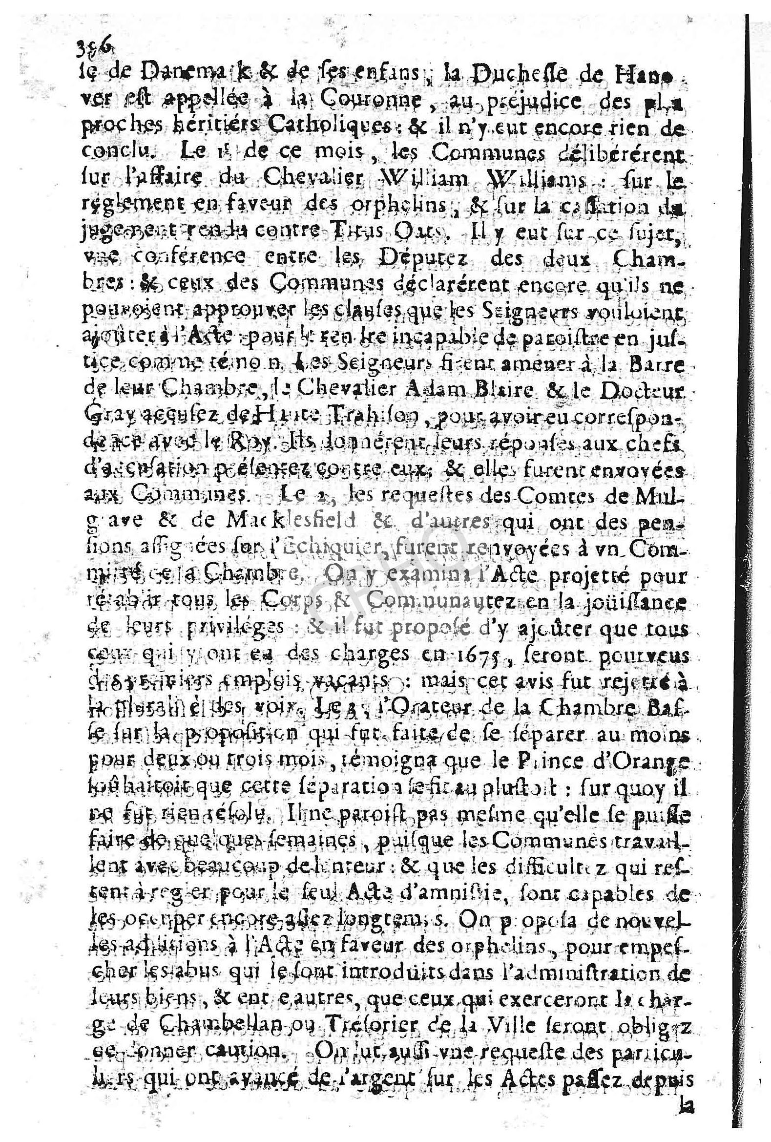 soûhaitoit que cette séparation se fit au plustost : sur quoy il ne fut rien résolu. Il ne paroist pas mesme qu’elle se puisse faire de quelques semaines, puisque les Communes travaillent avec beaucoup de lenteur : et que les difficultez qui restent à regler pour le seul Acte d’amnistie, sont capables de les occuper encore assez longtemps. On proposa de nouvelles additions à l’Acte en faveur des orphelins, pour empescher les abus qui le sont introdüits dans l’administration de leurs biens, et entre autres, que ceux qui exerceront la charge de Chambellan ou Trésorier de la Ville seront obligez de donner caution. On lut aussi vne requeste des particuliers qui ont avancé de l’argent sur les Actes passez depuisla révolution générale des affaires, pour se faire assurer vn fonds sur lequel ils puissent estre remboursez. On envoya vn message aux Seigneurs, pour les prier d’expédier promtement les Actes pour le reglement des milices : pour déclarer Traistres, ceux qui ont suivi