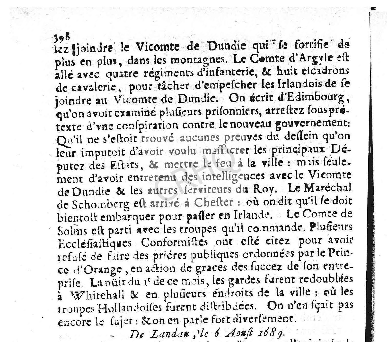estoit encore dans le lac de Londonderry, sans avoir pû faire entrer du secours dans la place, ny tenter le débarquement, à cause des fortifications qui ont esté faites sur les bords, et des estacades qui traversent la riviére. On parle de lever de nouveaux régiments pour envoyer en Hollande. Ceux de Mylord Colchester et du Colonel Longston sont en marche pour passer en Escosse : où on craint quelque soulevement, principalement depuis qu’il y est arrivé des troupes d’Irlande. Suivant les derniers avis, elles sont environ de quinze cents hommes, parmy lesquels il y a cent cinquante officiers. Les vaisseaux qui les ont transportez avoient paru sur les costes d’Argyle : mais on les a veus depuis vers celles de Lochaber : ce qui fait croire qu’ils sont allezjoindre le Vicomte de