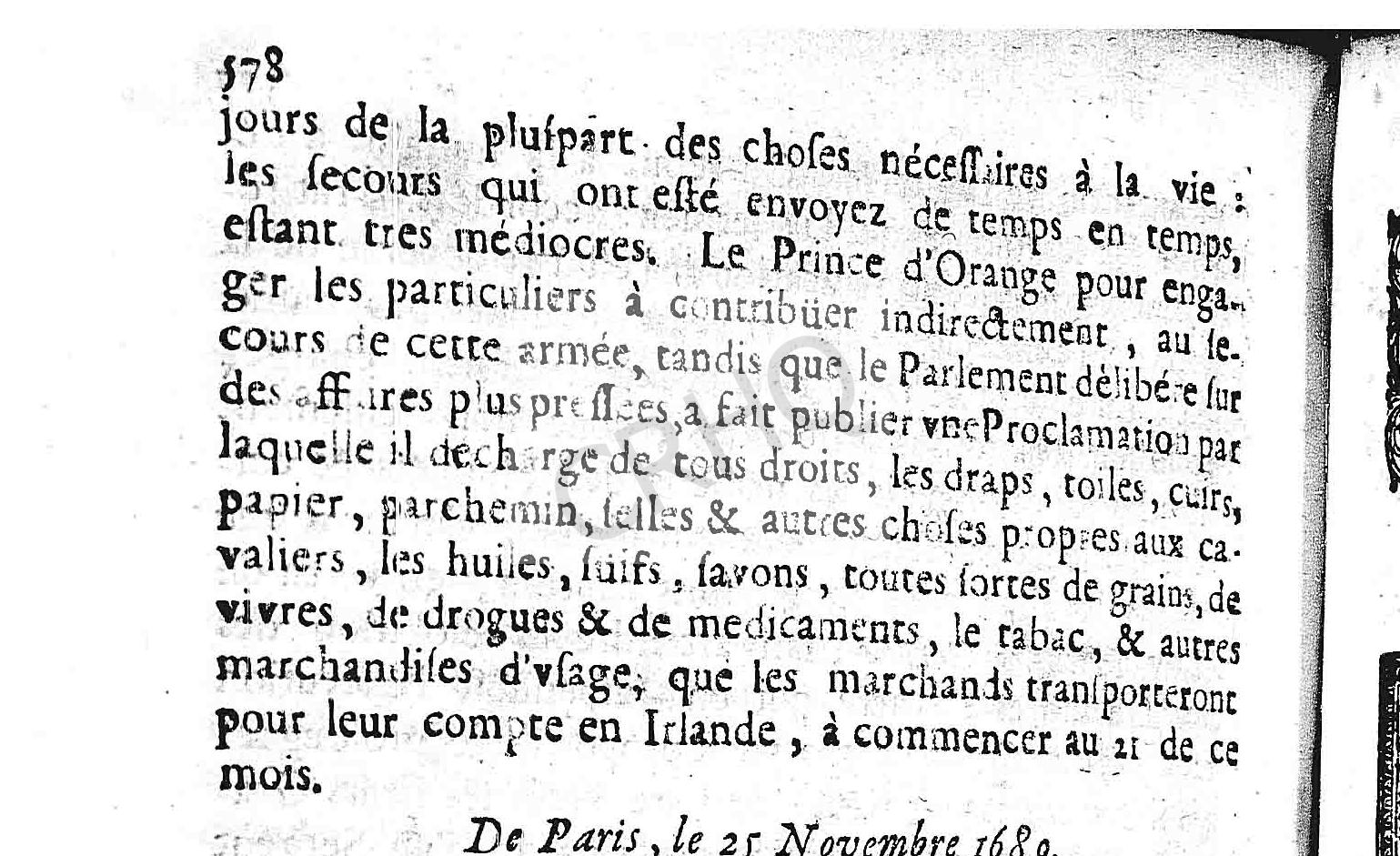 pour engager les particuliers à contribüer indirectement, au secours de cette armée, tandis que le Parlement délibére sur des affaires plus pressées, a fait publier vne Proclamation par laquelle il décharge de tous droits, les draps, toiles, cuirs, papier, parchemin, selles et autres choses propres aux cavaliers, les huiles, suifs, savons, toutes sortes de grains, de vivres, de drogues et de medicaments, le tabac, et autres marchandises d’vsage, que les marchands transporteront pour leur compte en Irlande, à commencer au 21 de ce mois.