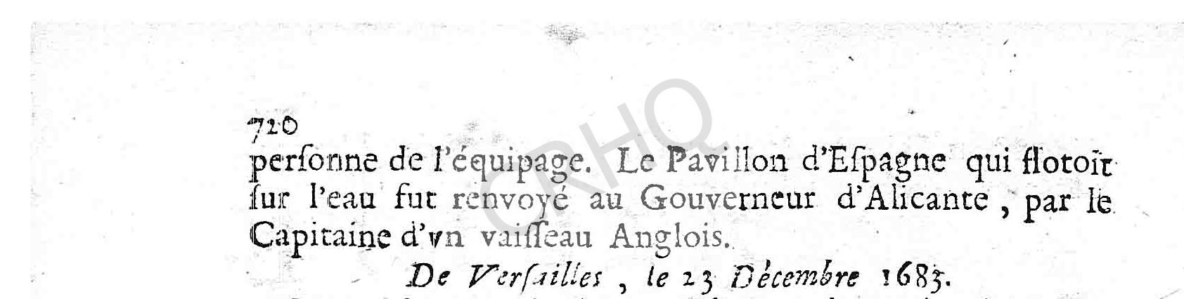 personne de l’équipage. Le Pavillon d’Espagne qui flotoit sur l’eau fut renvoyé au Gouverneur d’Alicante, par le Capitaine d’vn vaisseau Anglois.