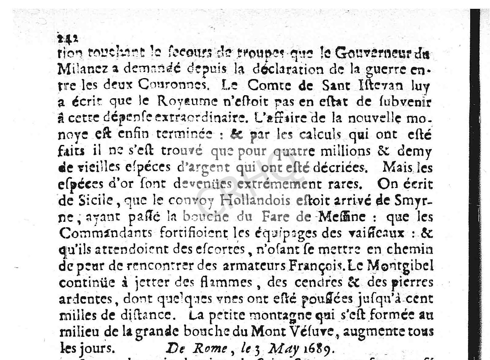 On écrit de Sicile, que le convoy Hollandois estoit arrivé de Smyrne, ayant passé la bouche du Fare de Messine : que les Commandants fortifioient les équipages des vaisseaux : et qu’ils attendoient des escortes, n’osant se mettre en chemin de peur de rencontrer des armateurs François.