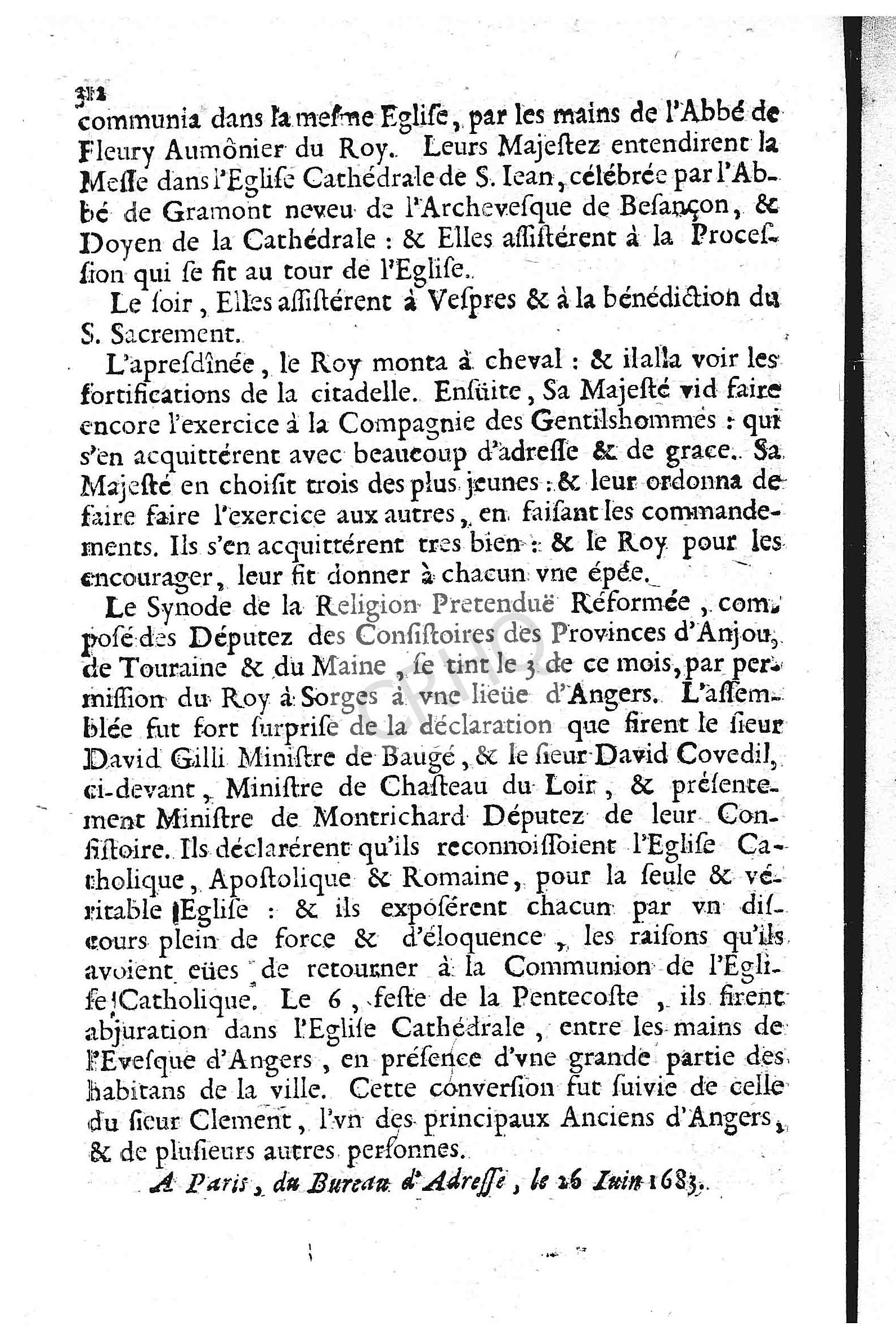 à Sorges à vne lieüe d’Angers. L’assemblée fut fort surprise de la déclaration que firent le sieur David Gilli Ministre de Baugé, et le sieur David Covedil, ci-devant, Ministre de Chasteau du Loir, et présentement Ministre de Montrichard Députez de leur Consistoire. Ils déclarérent qu’ils reconnoissoient l’Eglise Catholique, Apostolique et Romaine, pour la seule et véritable Eglise : et ils exposérent chacun par vn discours plein de force et d’éloquence, les raisons qu’ils avoient eües de retourner à la Communion de l’Eglise Catholique. Le 6, feste de la Pentecoste, ils