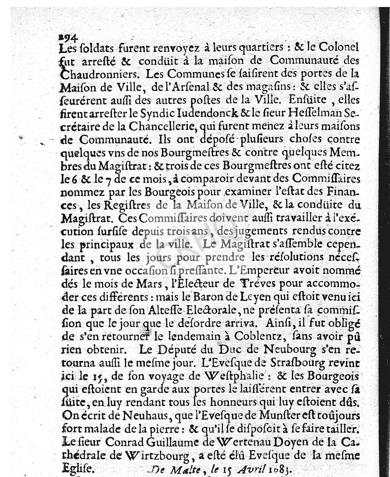 Ensüite, elles firent arrester le Syndic Iudendonck et le sieur Hesselman Secrétaire de la Chancellerie, qui furent menez à leurs maisons de Communauté. Ils ont déposé plusieurs choses contre quelques vns de nos Bourgmestres et contre quelques Membres du Magistrat : et trois de ces Bourgmestres ont esté citez le 6 et le 7 de ce mois, à comparoir devant des Commissaires nommez par les Bourgeois pour examiner l’estat des Finances, les Registres de la Maison de Ville, et la condüite du Magistrat. Ces Commissaires doivent aussi travailler à l’exécution sursise depuis trois ans, des jugements rendus contre les principaux de la ville. Le Magistrat s’assemble cependant, tous les jours pour prendre les résolutions nécessaires en vne occasion si pressante. L’
