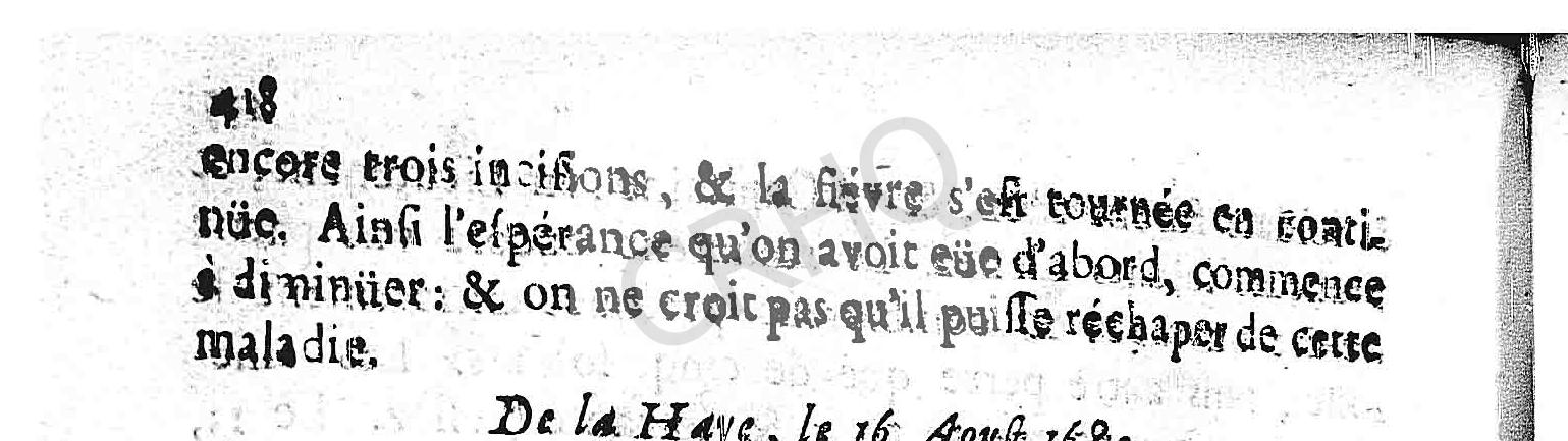 encore trois incisions, et la fiévre s’est tournée en continüe. Ainsi l’espérance qu’on avoit eüe d’abord, commence à diminüer : et on ne croit pas qu’il puisse réchaper de cette maladie.