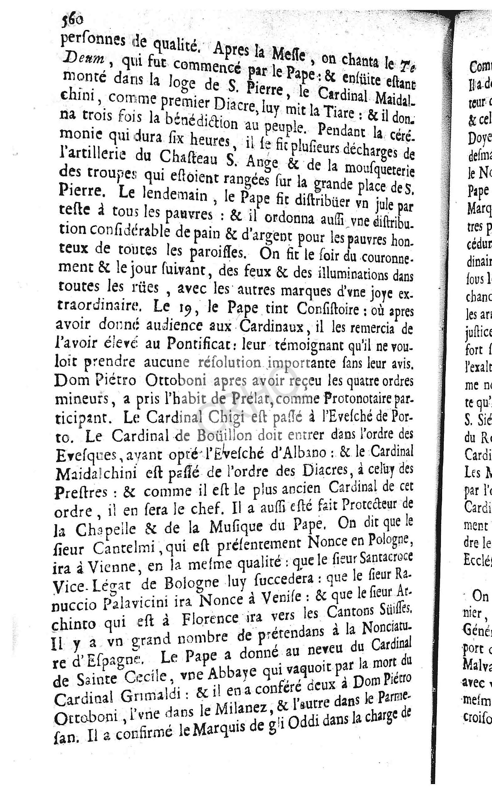 tint Consistoire : où apres avoir donné audience aux Cardinaux, il les remercia de l’avoir élevé au Pontificat : leur témoignant qu’il ne vouloit prendre aucune résolution importante sans leur avis. Dom Piétro Ottoboni apres avoir reçeu les quatre ordres mineurs, a pris l’habit de Prélat, comme Protonotaire participant. Le Cardinal Chigi est passé à l’Evesché de Porto. Le