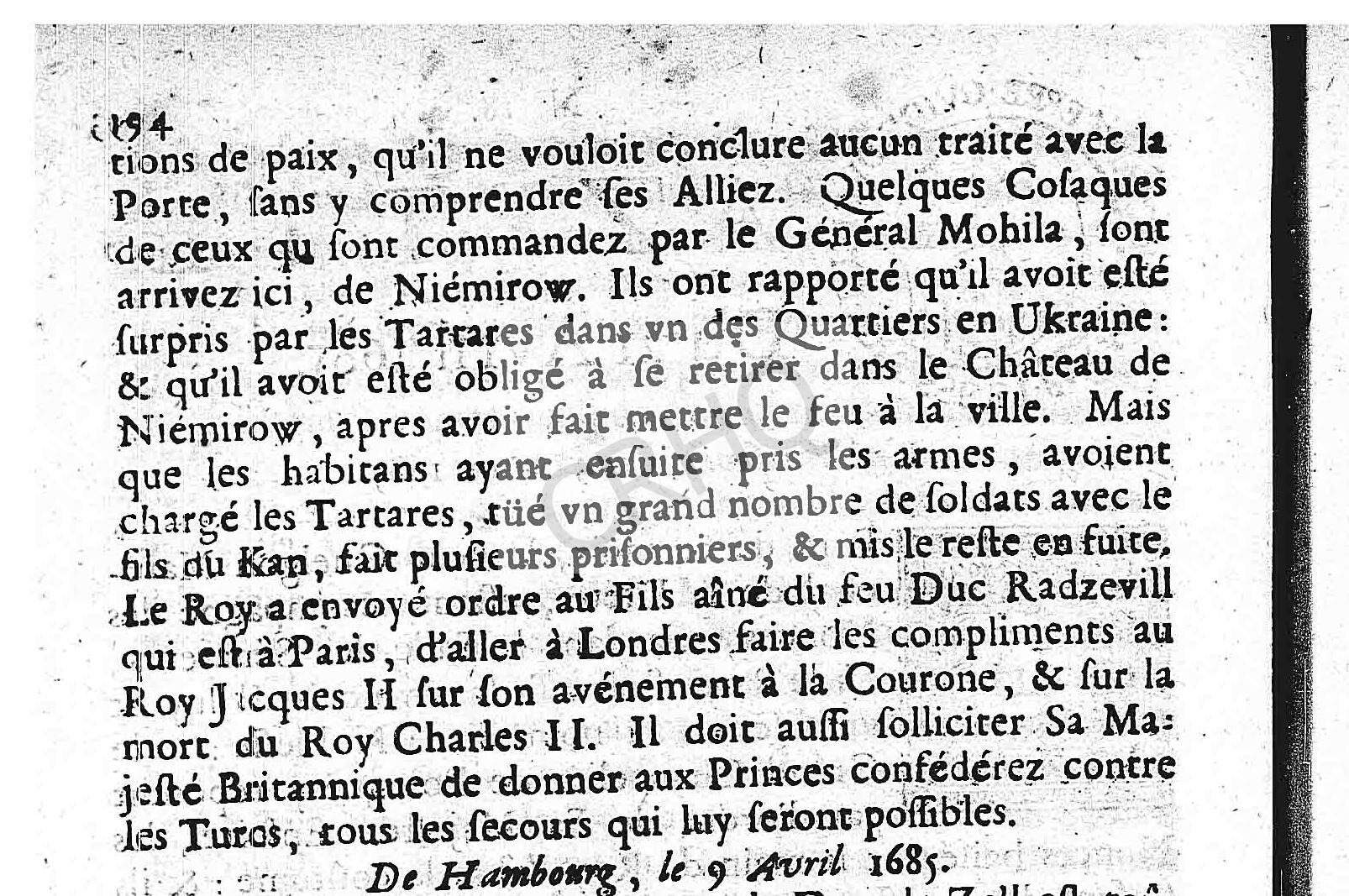 tions de paix , qu’il ne vouloit conclure aucun traité avec la Porte , sans y comprendre ses Alliez. Quelques Cosaques de ceux qui sont commandez par le Général Mohila , sont arrivez ici , de Niémirow. Ils ont rapporté qu'il avoit esté surpris par les Tartares dans un des Quartiers en Ukraine : & qu'il avoit esté obligé à se retirer dans le Château de Niémirow , apres avoir fait