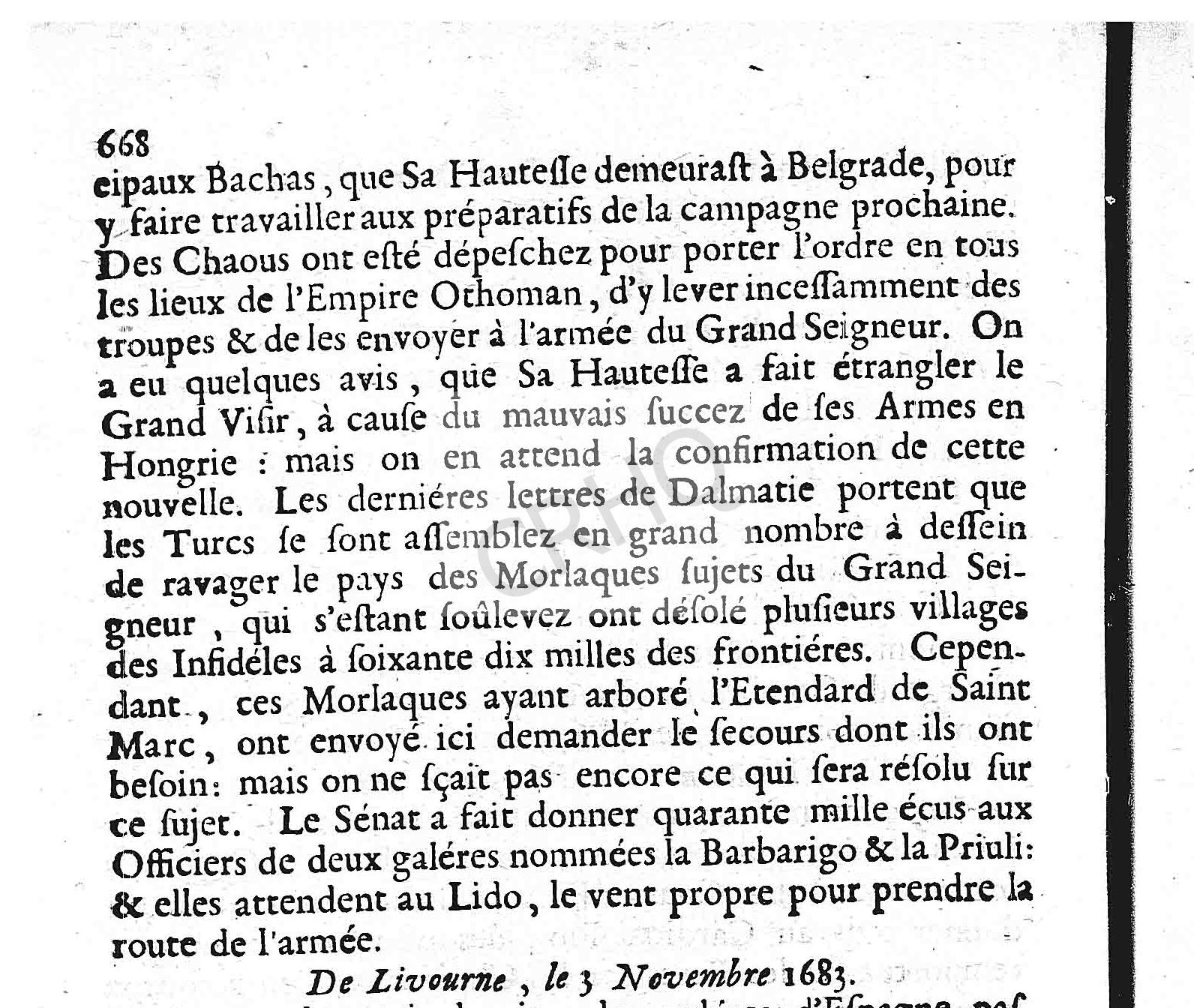 , à cause du mauvais succez de ses Armes en Hongrie : mais on en attend la confirmation de cette nouvelle. Les derniéres lettres de Dalmatie portent que les Turcs se sont assemblez en grand nombre à dessein de ravager le pays des Morlaques sujets du