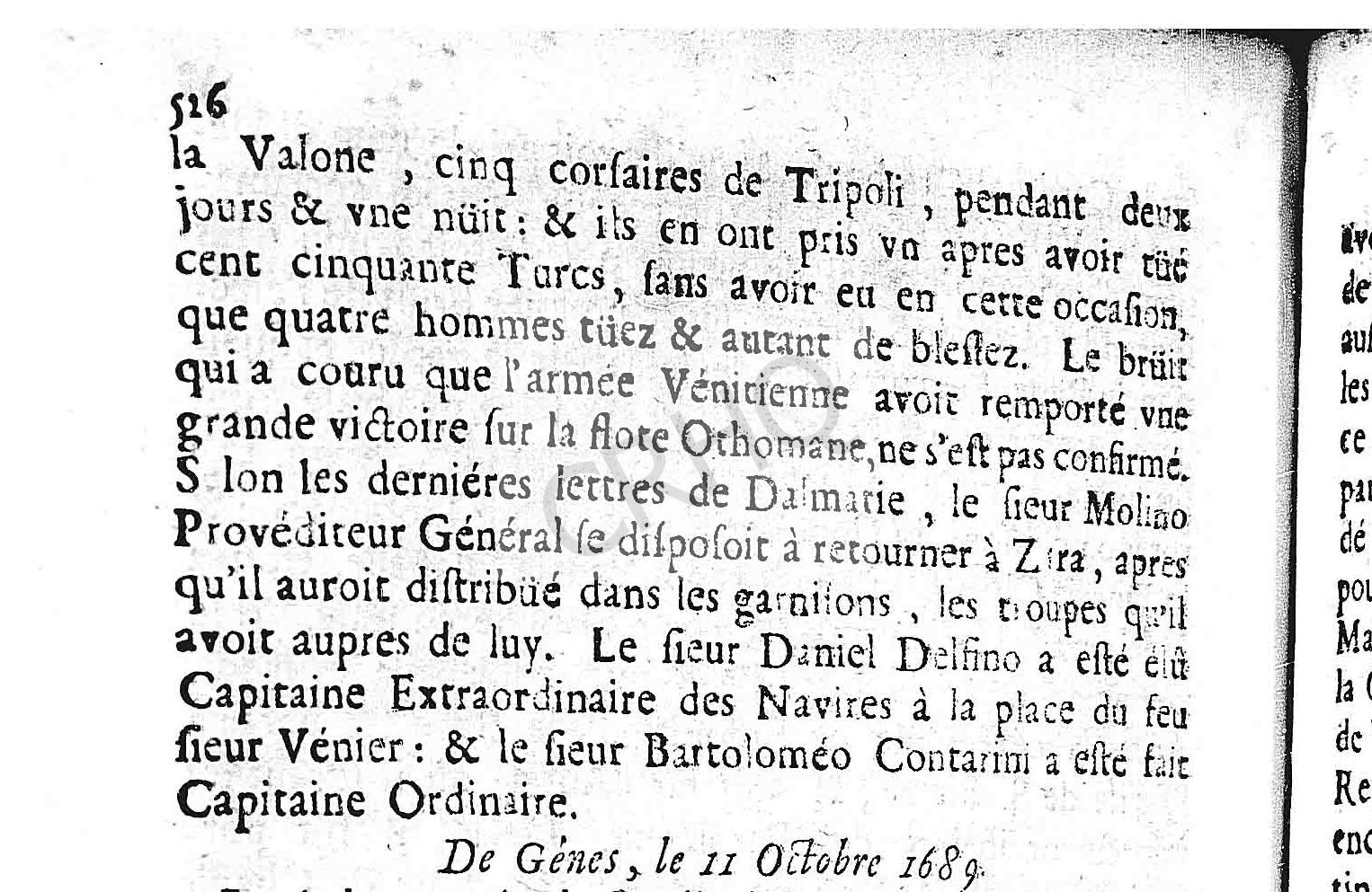 Le brüit qui a couru que l’armée Vénitienne avoit remporté vne grande victoire sur la flote Othomane, ne s’est pas confirmé. Selon les derniéres lettres de Dalmatie, le sieur Molino Provéditeur Général se disposoit à retourner à Zira, apres qu’il auroit distribüé dans les garnisons, les troupes qu’il avoit aupres de luy. Le sieur Daniel Delfino a esté élû Capitaine Extraordinaire des Navires à la place du feu sieur Vénier : et le sieur Bartoloméo Contarim a esté fait Capitaine Ordinaire.