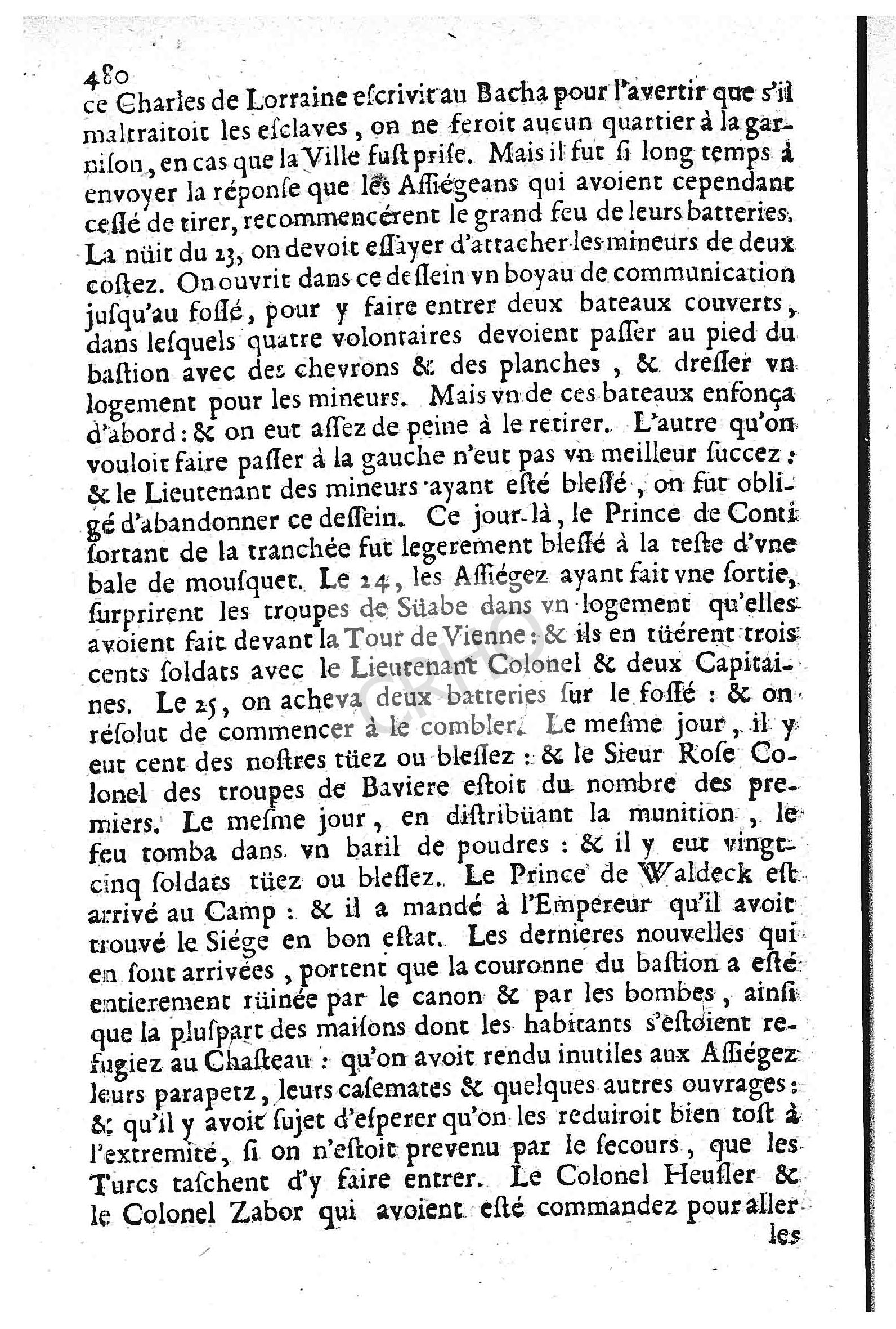 qu'il avoit trouvé le Siége en bon estat. Les dernieres nouvelles qui en sont arrivées , portent que la couronne du bastion a esté entierement rüinée par le canon & par les bombes , ainsi que la pluspart des maisons dont les habitants s'estoient refugiez au Chasteau : qu'on avoit rendu inutiles aux Assiégez leurs parapetz , leurs casemates & quelques autres ouvrages : & qu'il y avoit sujet d'esperer qu'on les reduiroit bien tost à l'extremité, si on n'estoit prevenu par le secours , que les Turcs taschent d'y faire entrer. Le Colonel Heusler & le Colonel Zabor qui avoient esté commandez pour aller lesreconnoistre , sont revenus au Camp , avec quelques prisonniers qu’ils ont faits au dessous de Gran apres avoir tüé environ trente de ces Infideles. Ils ont rapporté que toute l'armée Othomane estoit arrivée à Bude : que le Seraskier Bacha y avoit desja passé le Danube, en résolution suivant l’ordre expres qu’il en avoit , de marcher incessamment pour la delivrance de Neuhausel : & qu’il avoit prés de Novigrad douze mille Tartares prests à joindre les Turcs. Quelques espions asseurent que l’armée Othomane est forte de soixante mille hommes ; & qu’elle marche avec quantité de riches équipages.