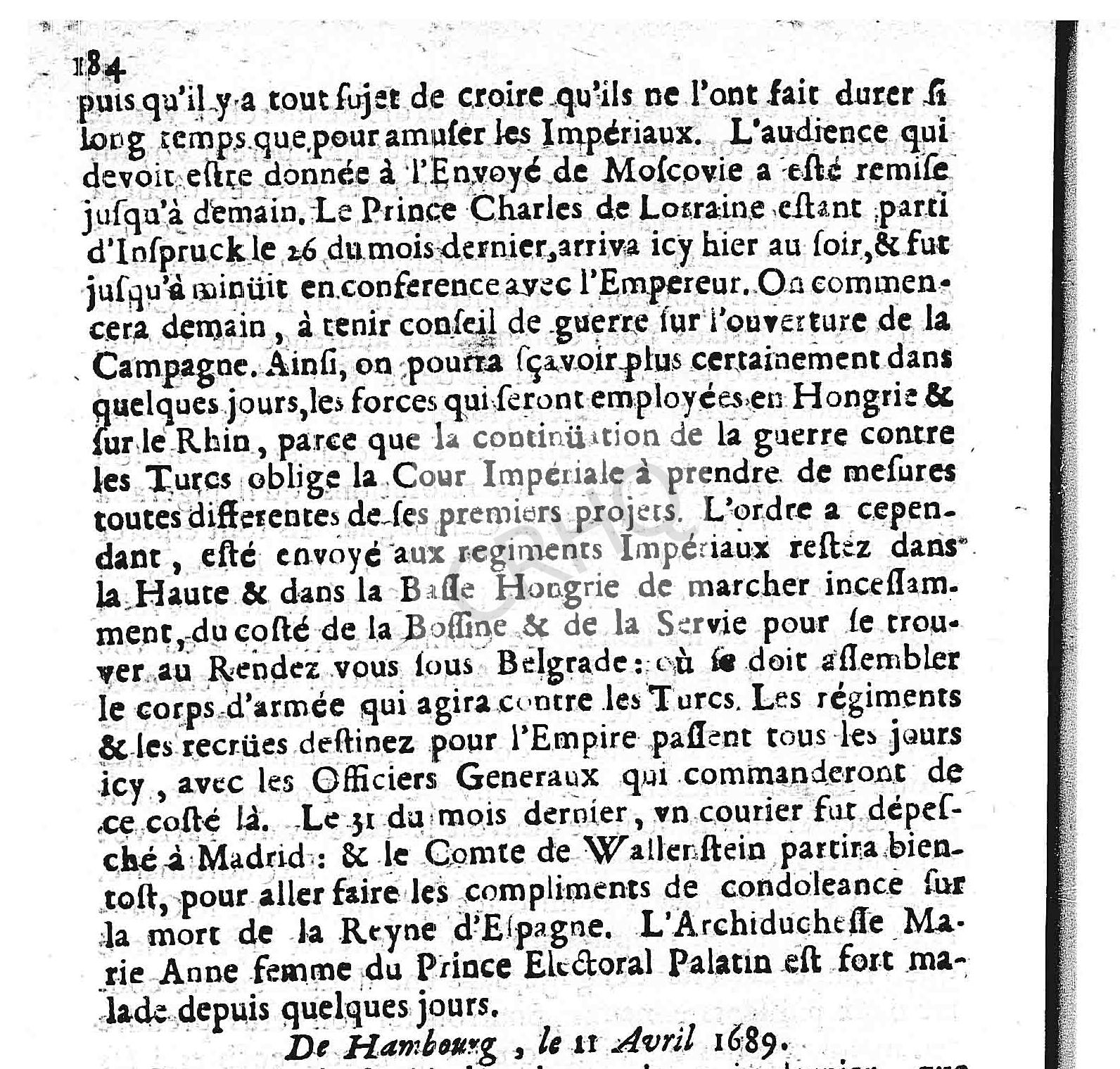 . On commencera demain, à tenir conseil de guerre sur l’ouverture de la Campagne. Ainsi, on pourra sçavoir plus certainement dans quelques jours, les forces qui seront employées en Hongrie et sur le Rhin, parce que la continüation de la guerre contre les Turcs oblige la Cour Impériale à prendre de mesures toutes differentes de ses premiers projets. L’ordre a cependant, esté envoyé aux regiments Impériaux restez dans la Haute et dans la Basse Hongrie de marcher incessamment, du costé de la Bossine et de la Servie pour se trouver au Rendez vous sous Belgrade : où se doit assembler le corps d’armée qui agira contre les Turcs. Les régiments et les recrües destinez pour l’Empire passent tous les jours icy, avec les Officiers Generaux qui commanderont de ce costé là. Le 31 du mois dernier, vn courier fut dépesché à Madrid : et le Comte de Wallenstein partira bientost, pour aller faire les compliments de condoleance sur la mort de