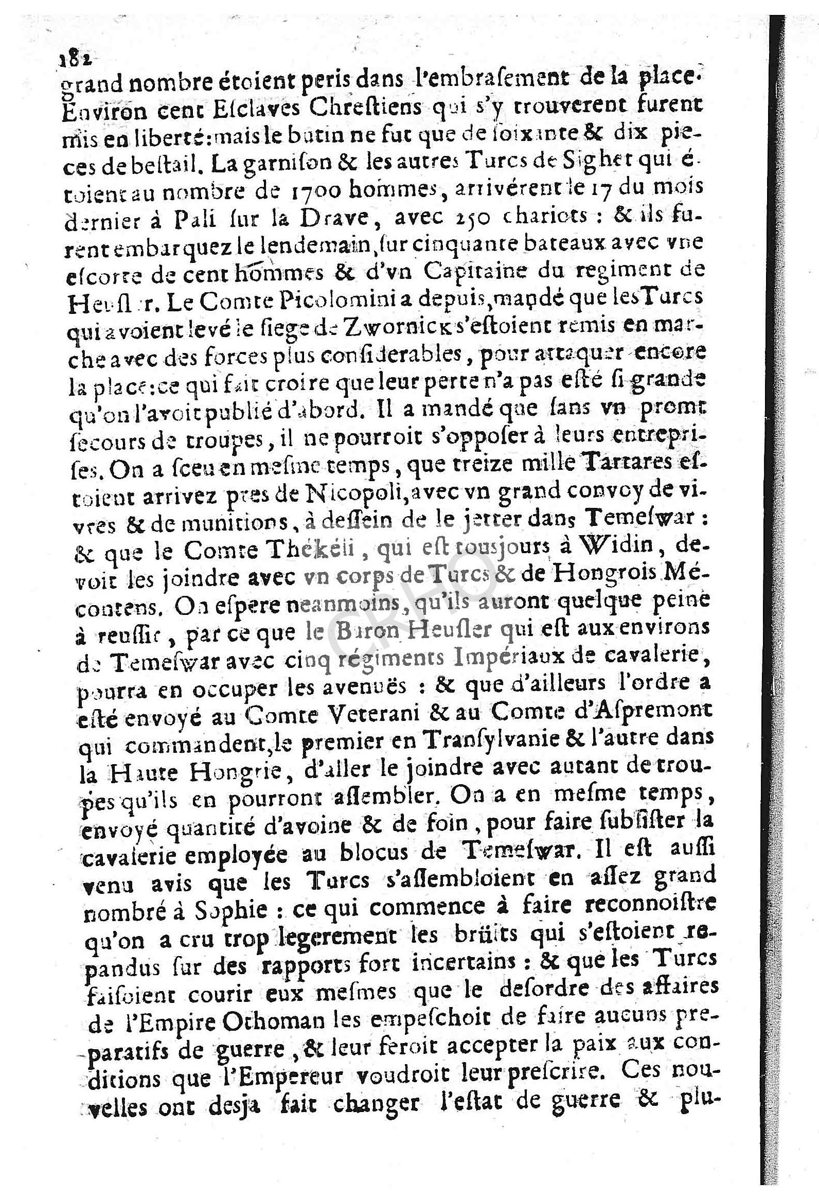 : mais le butin ne fut que de soixante et dix pieces de bestail. La garnison et les autres Turcs de Sighet qui étoient au nombre de 1700 hommes, arrivérent le 17 du mois dernier à Pali sur la Drave, avec 250 chariots : et ils furent embarquez le lendemain, sur cinquante bateaux avec vne escorte de cent hommes et d’vn Capitaine du regiment de Heusler. Le Comte Picolomini a depuis, mandé que les Turcs qui avoient levé le siege de Zwornick s’estoient remis en marche avec des forces plus considerables, pour attaquer encore la place : ce qui fait croire que leur perte n’a pas esté si grande qu’on l’avoit publié d’abord. Il a mandé que sans vn promt secours de troupes, il ne pourroit s’opposer à leurs entreprises. On a sceu en mesme temps, que treize mille Tartares estoient arrivez pres de Nicopoli, avec vn grand convoy de vivres et de munitions, à dessein de le jetter dans Temeswar : et que