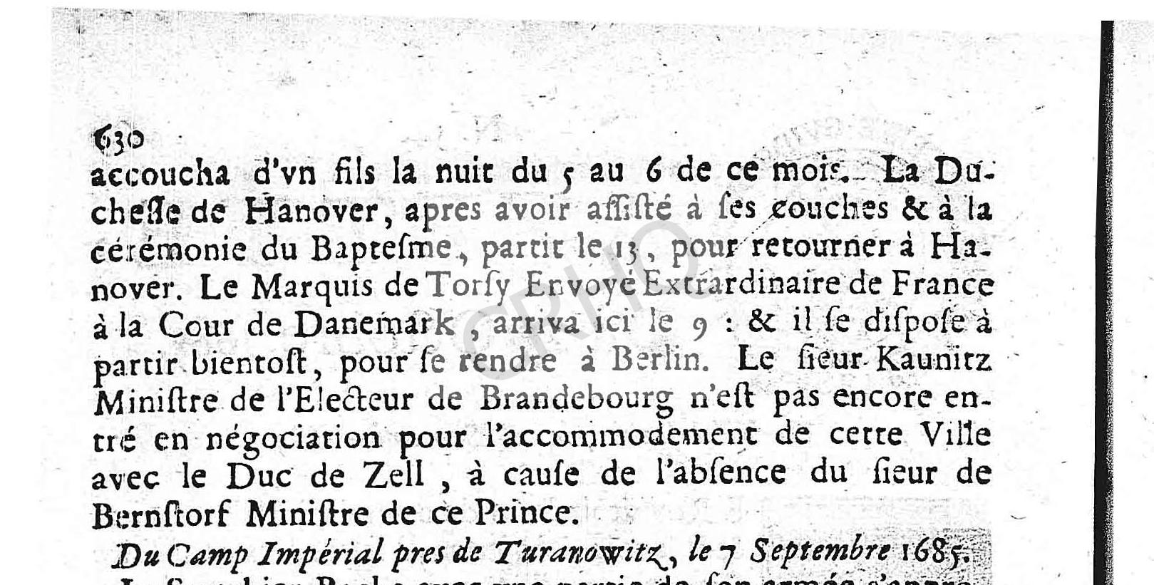 accoucha d'un fils la nuit du 5 au 6 de ce mois. La Duchesse de Hanover, aprés avoir assisté à ses couches & à la cérémonie du Baptesme, partit le 13 , pour retourner à Hanover. Le Marquis de Torsy Envoyé Extraordinaire de France à la Cour de Danemark , arriva ici le 9 : & il se dispose à partir bientost, pour se rendre à Berlin. Le sieur Kauniitz Ministre de