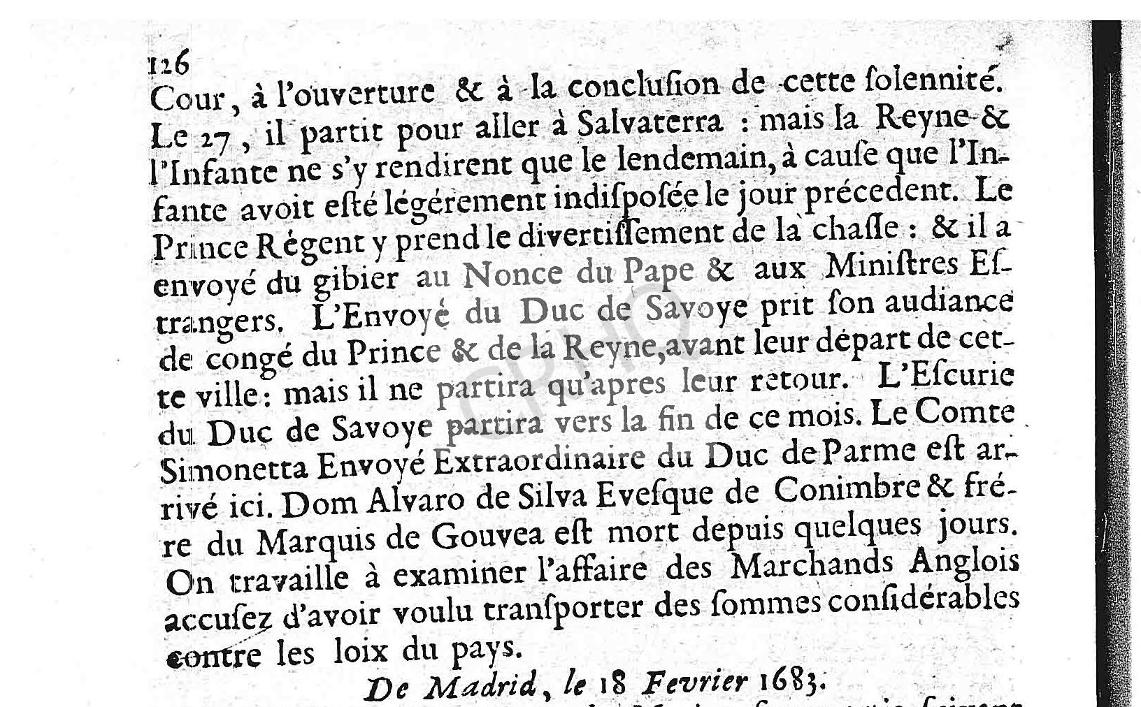 est arrivé ici. Dom Alvaro de Silva Evesque de Conimbre et frére du Marquis de Gouvea est mort depuis quelques jours. On travaille à examiner l’affaire des Marchands Anglois accusez d’avoir voulu transporter des sommes considérables contre les loix du pays.