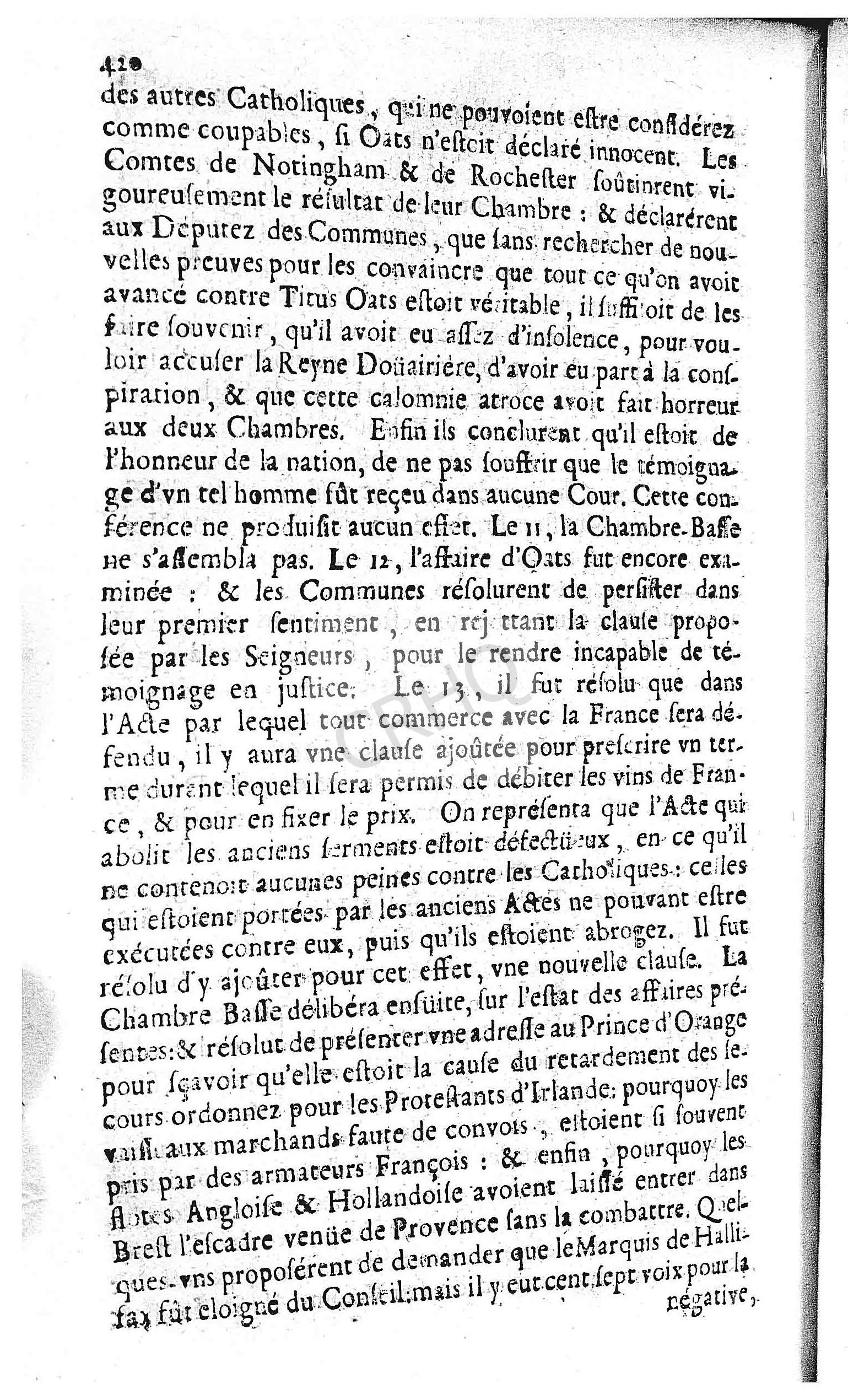 fut encore examinée : et les Communes résolurent de persister dans leur premier sentiment, en rejettant la clause proposée par les Seigneurs, pour le rendre incapable de témoignage en justice. Le 13, il fut résolu que dans l’Acte par lequel tout commerce avec la France sera défendu, il y aura vne clause ajoûtée pour prescrire vn terme durant lequel il sera permis de débiter les vins de France, et pour en fixer le prix. On représenta que l’Acte qui abolit les anciens serments estoit défectüeux, en ce qu’il ne contenoit aucunes peines contre les Catholiques : celles qui estoient portées par les anciens Actes ne pouvant estre exécutées contre eux, puis qu’ils estoient abrogez. Il fut résolu d’y ajoûter pour cet effet, vne nouvelle clause. La Chambre Basse délibéra ensüite, sur l’estat des affaires présentes : et résolut de présenter vne adresse au