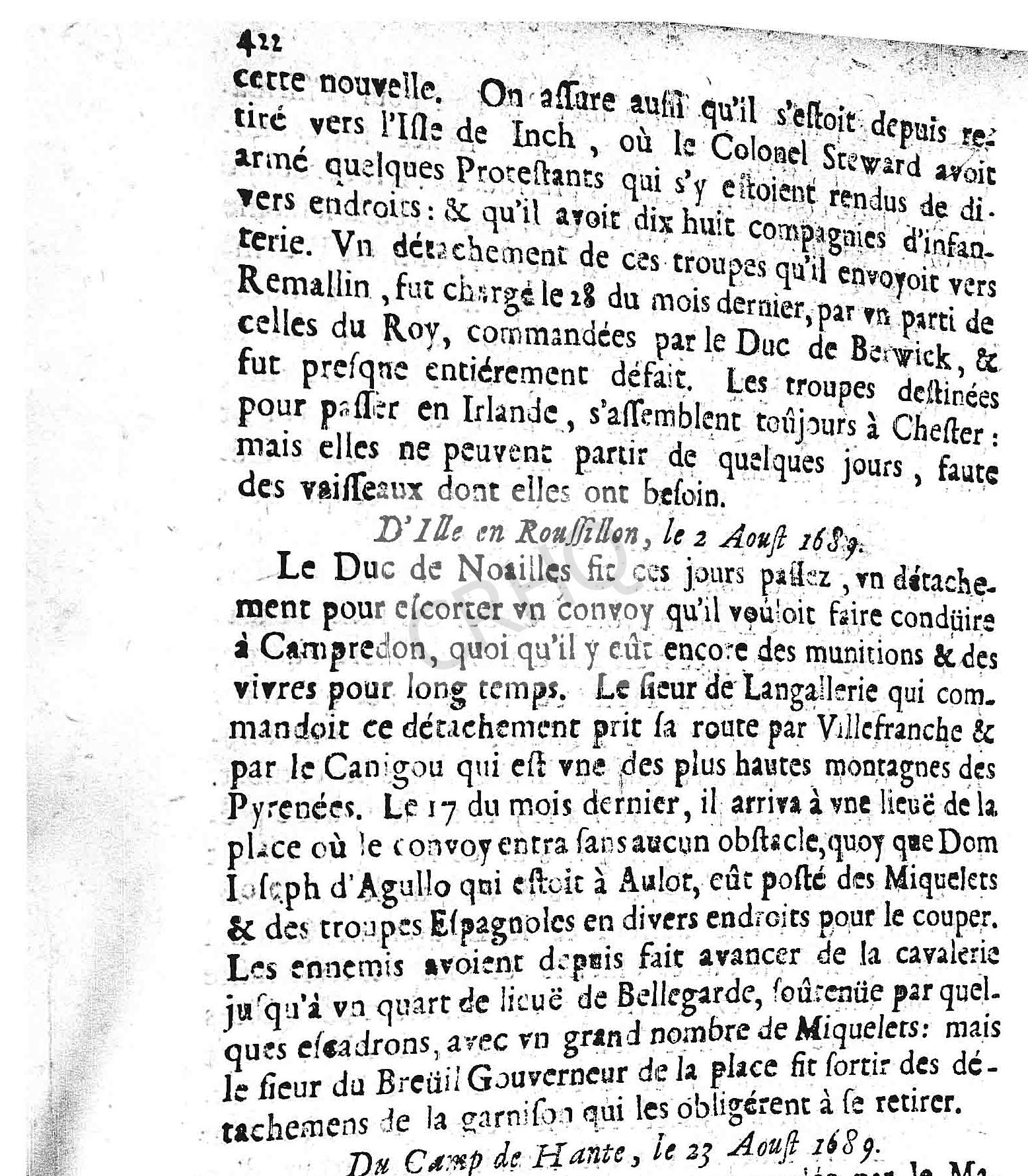 avoit fait entrer trois petits bastiments chargez de vivres dans Londonderry, avant forcé les estacades qui estoient à l’entrée de la riviére : et mesmes que le siége a esté levé. Mais on attend encore la confirmation decette nouvelle. On assure aussi qu’il s’estoit depuis retiré vers l’Isle d’Inch, où le Colonel