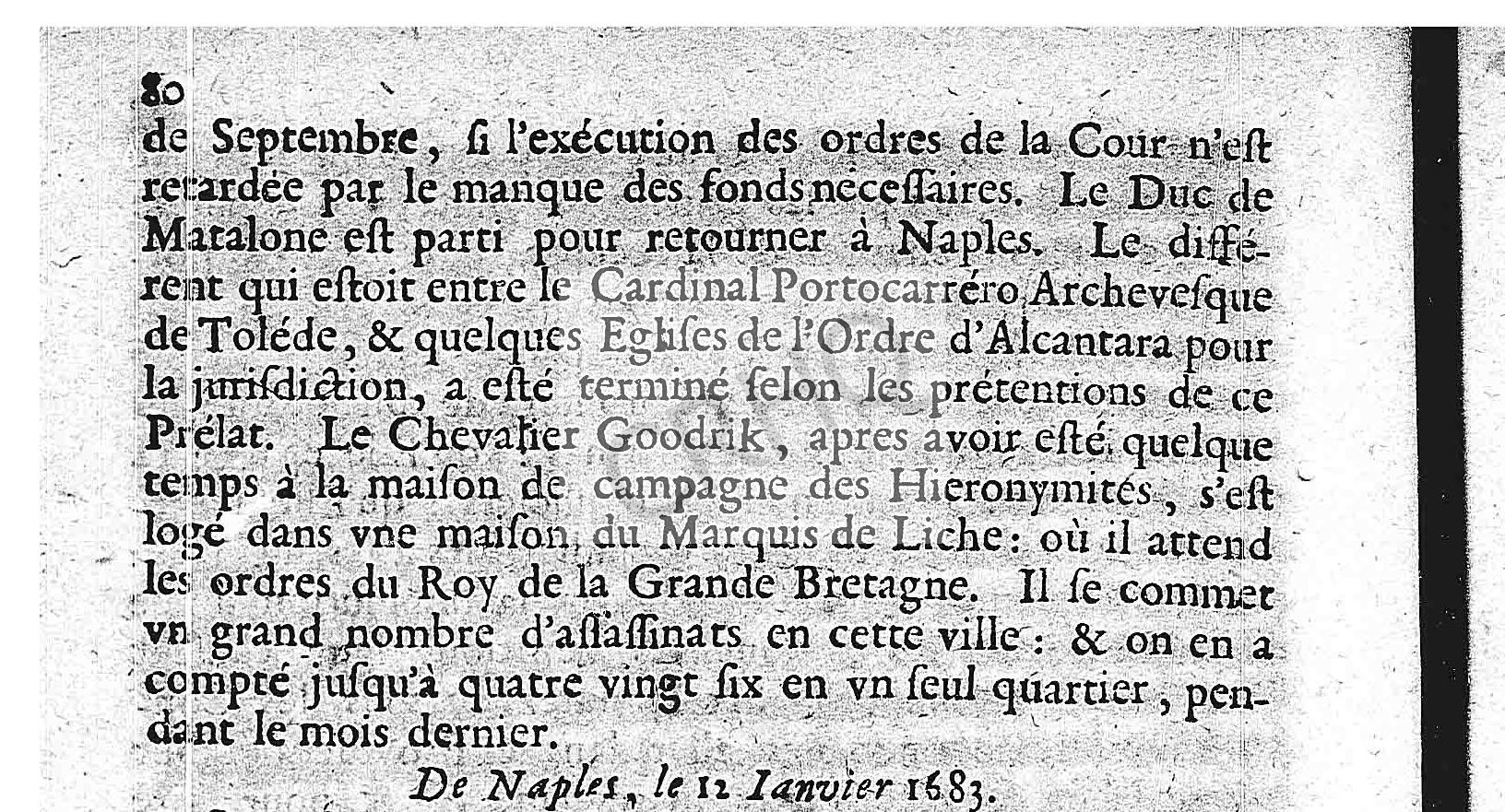 : et qu’on ne peut exiger ces mesmes droits en argent, sans rüiner vne partie de l’Espagne, particuliérement les pays éloignez de la mer qui n’ont aucun commerce, et dont la plus grande partie n’est pas cultivée. Ainsi on commence à douter du succez avantageux de cette proposition. Le Conseil Extraordinaire appellé , s’assemble souvent pour délibérer sur les moyens de trouver les fonds pour les dépenses que l’Estat est obligé de soûtenir dans les conjonctures présentes : mais il s’y trouve encore de grandes difficultez. Le dernier Courier a porté en Flandres, vne remise de cinquante mille écus pour les affaires des Pays Bas. On travaille à faire vn fonds de pareille somme, pour l’armement de nostre Armée navale, afin qu’elle puisse faire voile au commencement de Mars, selon les ordres envoyez à Cadix et en Biscaye. On travaille aussi à l’équipement de la flote des Indes, qui doit partir au mois prochain : et les galions partiront au mois de Septembre, si l’exécution des ordres de la Cour n’est retardée par le manque des fonds nécessaires. Le Duc de Matalone est parti pour retourner à Naples. Le différent qui estoit entre le Cardinal Portocarréro Archevesque de Toléde, et quelques Eglises de l’Ordre d’Alcantara pour la jurisdiction, a esté terminé selon les prétentions de ce Prélat. Le Chevalier Goodrik, apres avoir esté quelque temps à la maison de campagne des Hieronymités, s’est logé dans vne maison du