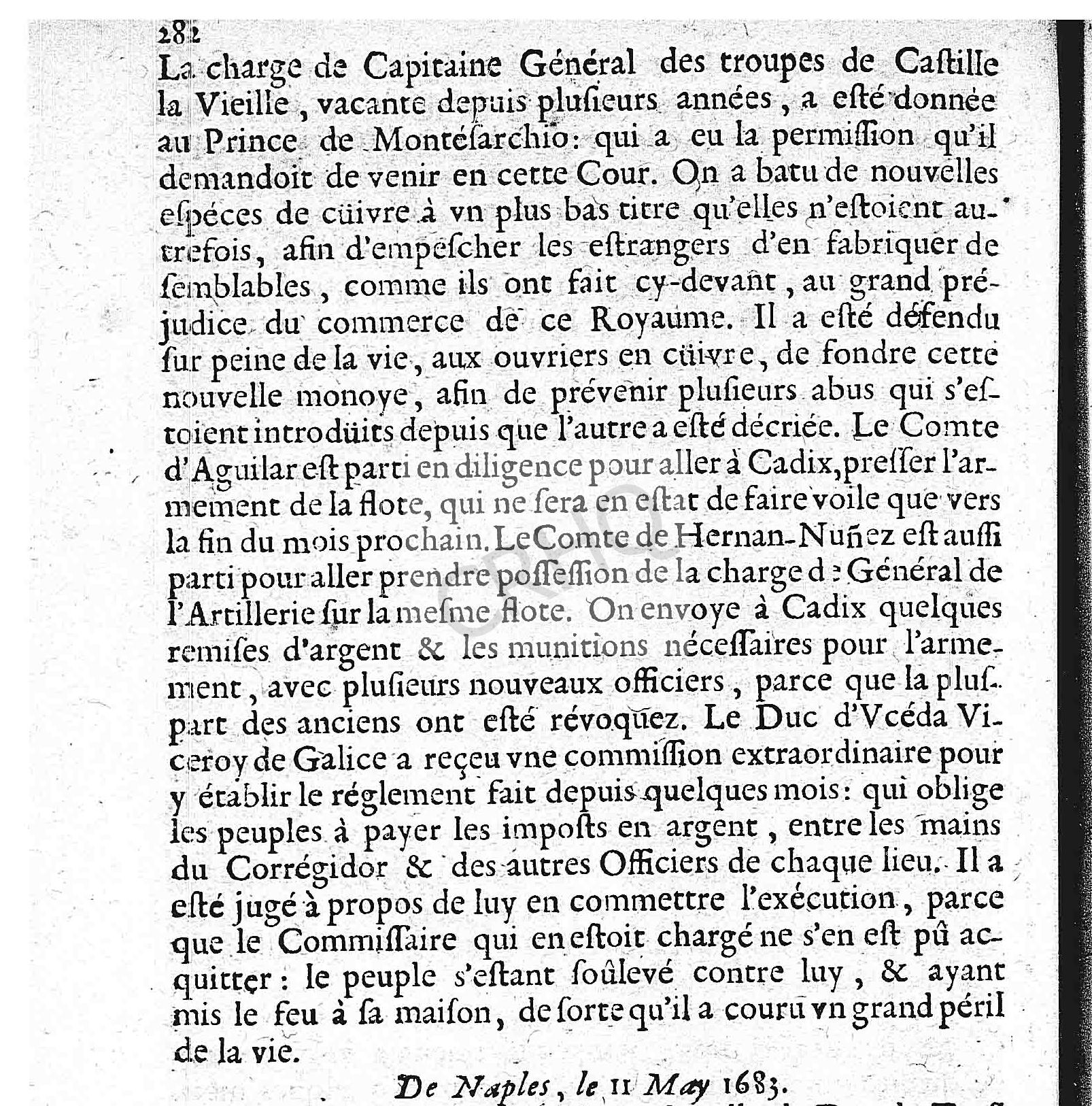 , comme ils ont fait cy-devant, au grand préjudice du commerce de ce Royaume. Il a esté défendu sur peine de la vie, aux ouvriers en cüivre, de fondre cette nouvelle monoye, afin de prévenir plusieurs abus qui s’estoient introdüits depuis que l’autre a esté décriée. Le Comte d’Aguilar est parti en diligence pour aller à Cadix, presser l’armement de la flote, qui ne sera en estat de faire voile que vers la fin du mois prochain. Le Comte de Hernan-Nuñez est aussi parti pour aller prendre possession de la charge de Général de l’Artillerie sur la mesme flote. On envoye à Cadix quelques remises d’argent et les munitions nécessaires pour l’armement, avec plusieurs nouveaux officiers, parce que la pluspart des anciens ont esté révoquez. Le Duc d’Vcéda Viceroy de Galice a reçeu vne commission extraordinaire pour y établir le réglement fait depuis quelques mois : qui oblige les peuples à payer les imposts en argent, entre les mains du Corrégidor et des autres Officiers de chaque lieu. Il a esté jugé à propos de luy en commettre l’exécution, parce que le Commissaire qui en estoit chargé ne s’en est pû acquitter : le
