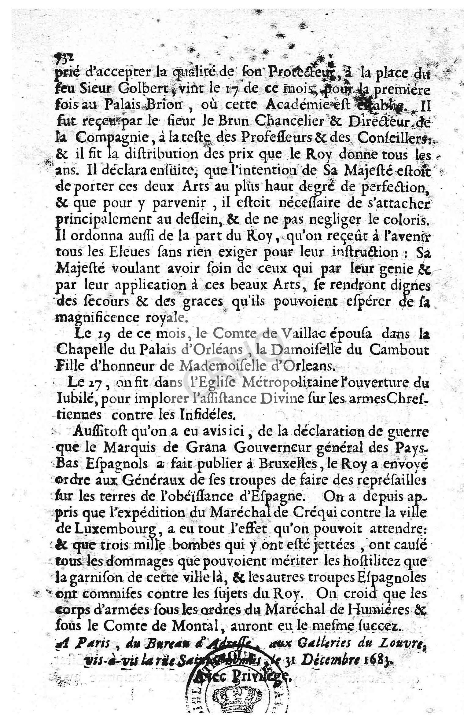 , vint le 17 de ce mois, pour la premiére fois au Palais Brion, où cette Académie est establie. Il fut reçeu par le sieur