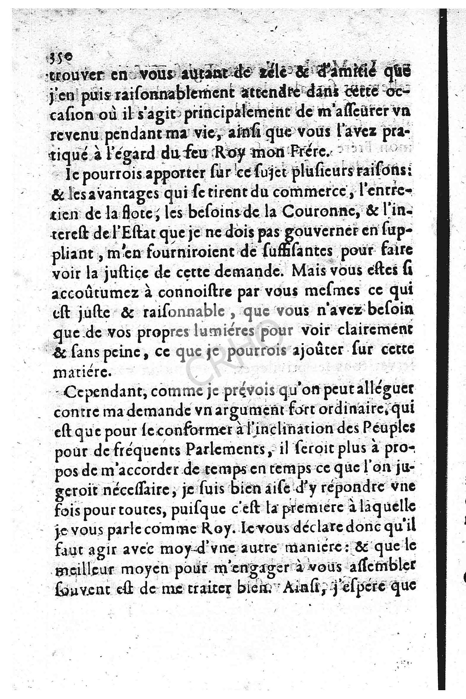 Cependant , comme je prévois qu'on peut alléguer contre ma demande un argument fort ordinaire , qui est que pour se conformer à l’inclination des Peuples pour de fréquents Parlements , il seroit plus à propos de m’accorder de temps en temps ce que l'on jugeroit nécessaire , je suis bien aise d'y répondre une fois pour toutes, puisque c'est la premiére à laquelle je vous parle comme Roy. Je vous déclare donc qu'il faut agir avec moy d'une autre maniére : & que le meilleur moyen pour m’engager à vous assembler souvent est de me traiter bien. Ainsi, j'espére quevous m’accorderez ce que je vous ay demandé , & que vous me l’accorderez promtement , afin que cette séance ne dure pas long temps , & que nous püissions nous revoir une autre fois, à vostre satisfaction.