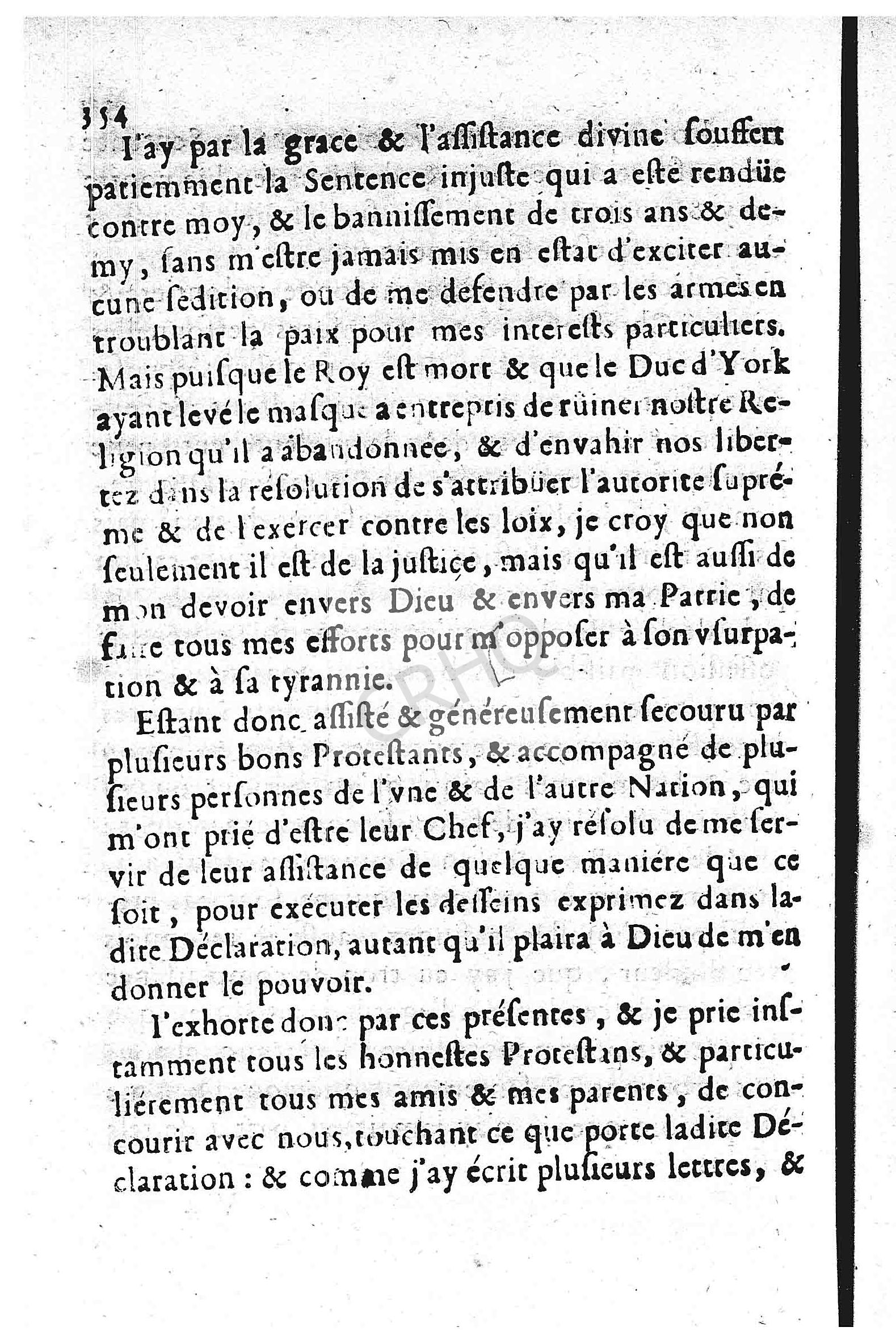 Estant donc assisté & généreusement secouru par plusieurs bons Protestants , & accompagné de plusieurs personnes de l'une & de l'autre Nation , qui m'ont prié d'estre leur Chef , j'ay résolu de me servir de leur assistance de quelque maniére que ce soit , pour exécuter les desseins exprimez dans la-dite Déclaration , autant qu'il plaira à Dieu de m'en donner le pouvoir.