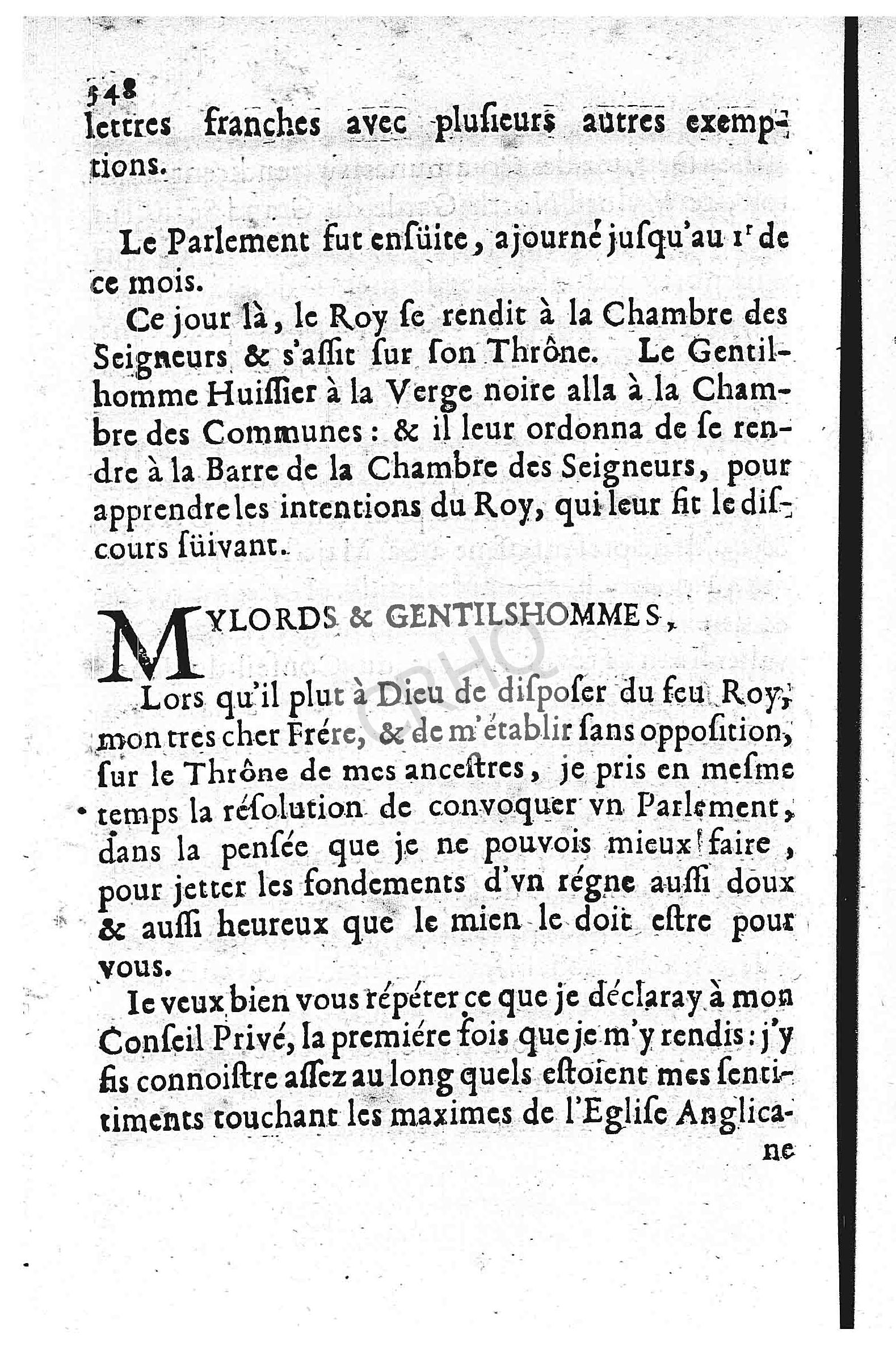 Je feray tous mes efforts pour maintenir les loix qui sont aujourdhuy , établies dans l'Eglise & dans l'Estat : & comme je ne permettray jamais qu'on viole en aucune maniére les prérogatives de la Couronne, aussi je ne feray tort à personne , ni dans ses biens ni dans ses droits. Et puis que par le passé j’ay hazardé souvent ma vie pour la défense de ma Nation , vous ne devez pas douter qu'à l'avenir , je ne m'employe autant qu'aucun de vous à luy conserver tous ses priviléges.