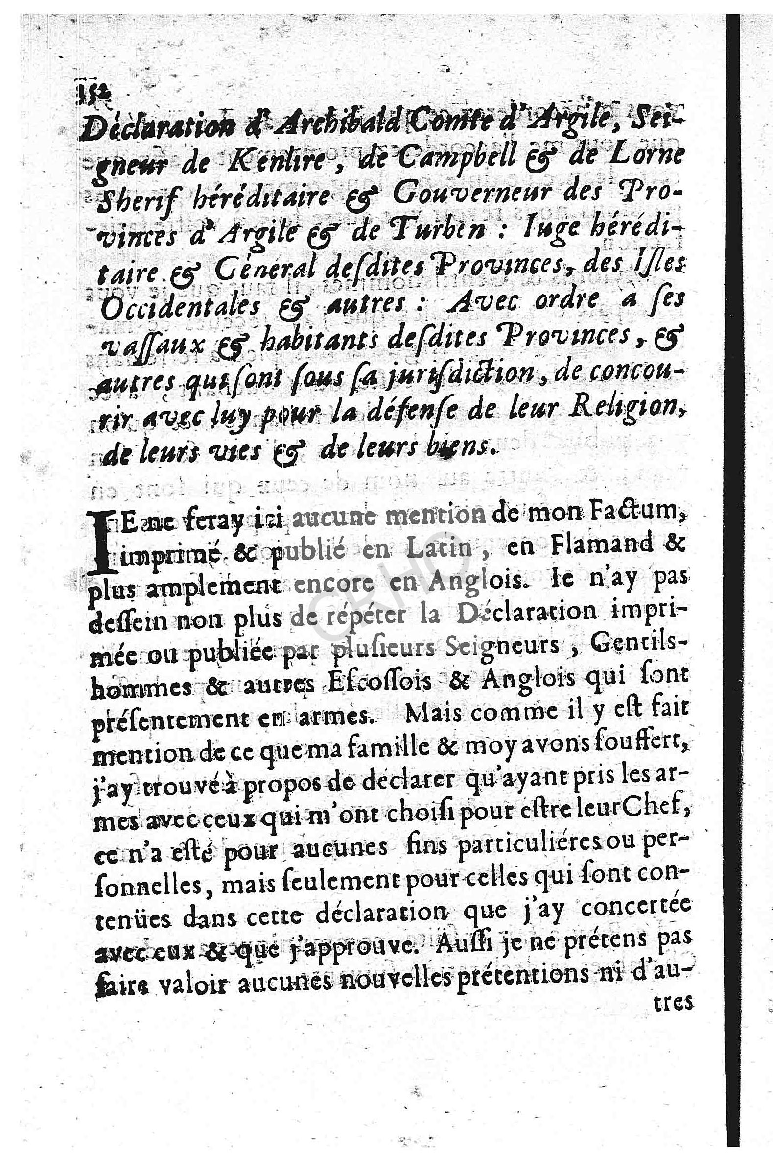 Je ne feray ici aucune mention de mon Factum, imprimé & publié en Latin , en Flamand & plus amplement encore en Anglois. Je n'ay pas dessein non plus de répéter la Déclaration imprimée ou publiée par plusieurs Seigneurs , Gentilshommes & autres Escossois & Anglois qui sont présentement en armes. Mais comme il y est fait mention de ce que ma famille & moy avons souffert, j’ay trouvé à propos de déclarer qu'ayant pris les armes avec ceux qui m'ont choisi pour estre leur Chef , ce n'a esté pour aucunes fins particuliéres ou personnelles , mais seulement pour celles qui sont contenües dans cette déclaration que j'ay concertée avec eux & que j’pprouve. Aussi je ne prétens pas faire valoir aucunes nouvelles prétentions ni d'autres droits que ceux que j’avois avant la Sentence de confiscation de corps & de biens rendüe contre moy & contre ma famille , sur lesquels la justice de ma causee est suffisamment établie.