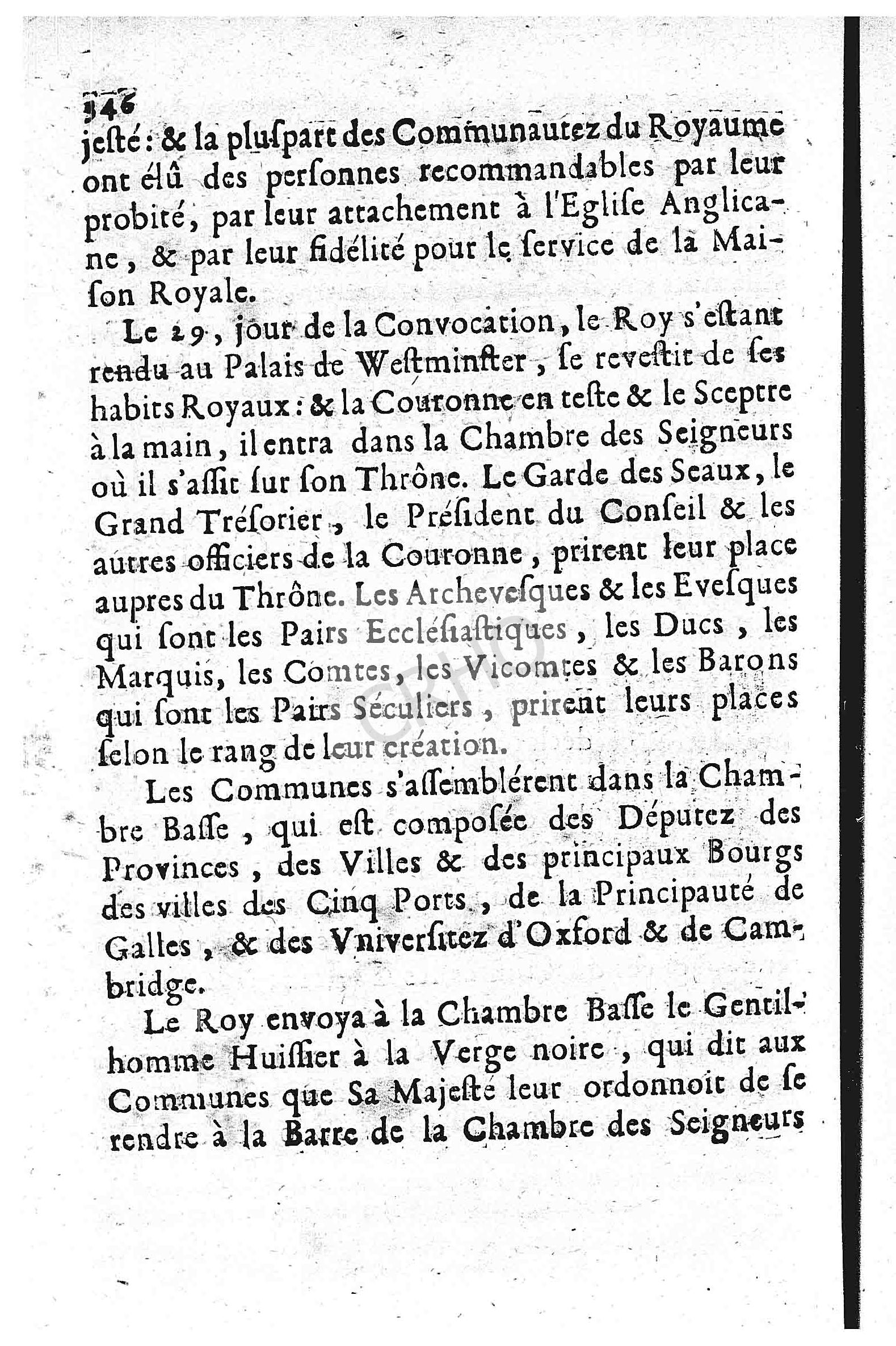 avoit déclaré à ses sujets, par une proclamation publiée dés les premiers jours de son Régne , qu'il estoit résolu d'assembler promtement le Parlement du Royaume. Il fit peu de temps apres , publier les Lettres circulaires ,qui furent envoyées dans toutes les Comtez , afin que les assemblées Provinciales & celles des Villes & des Bourgs se fissent pour l'élection des Députez qui devoient entrer à la Chambre Basse. Toutes les élections ont esté faites à la satisfaction de Sa Majesté