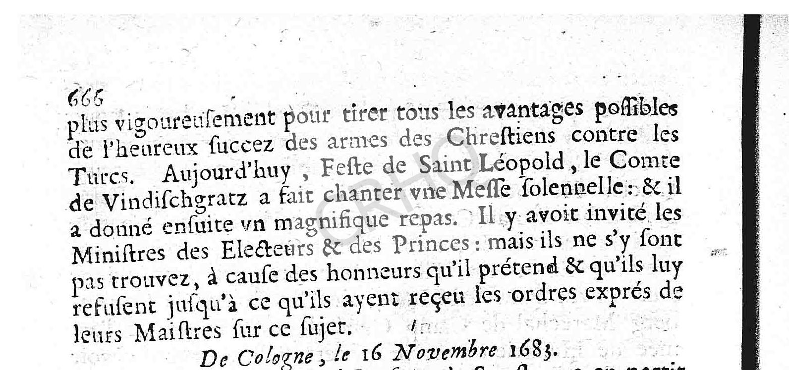 plus vigoureusement pour tirer tous les avantages possibles de l’heureux succez des armes des Chrestiens contre les Turcs. Aujourd’huy, Feste de Saint Léopold, le