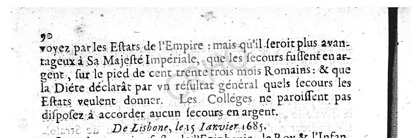 , que les secours fussent en argent , sur le pied de cent trente trois mois Romains : & que la Diéte déclarât par un résultat général quels secours les Estats veulent donner. Les Colléges ne paroissent pas disposez .à accorder aucun secours en argent.