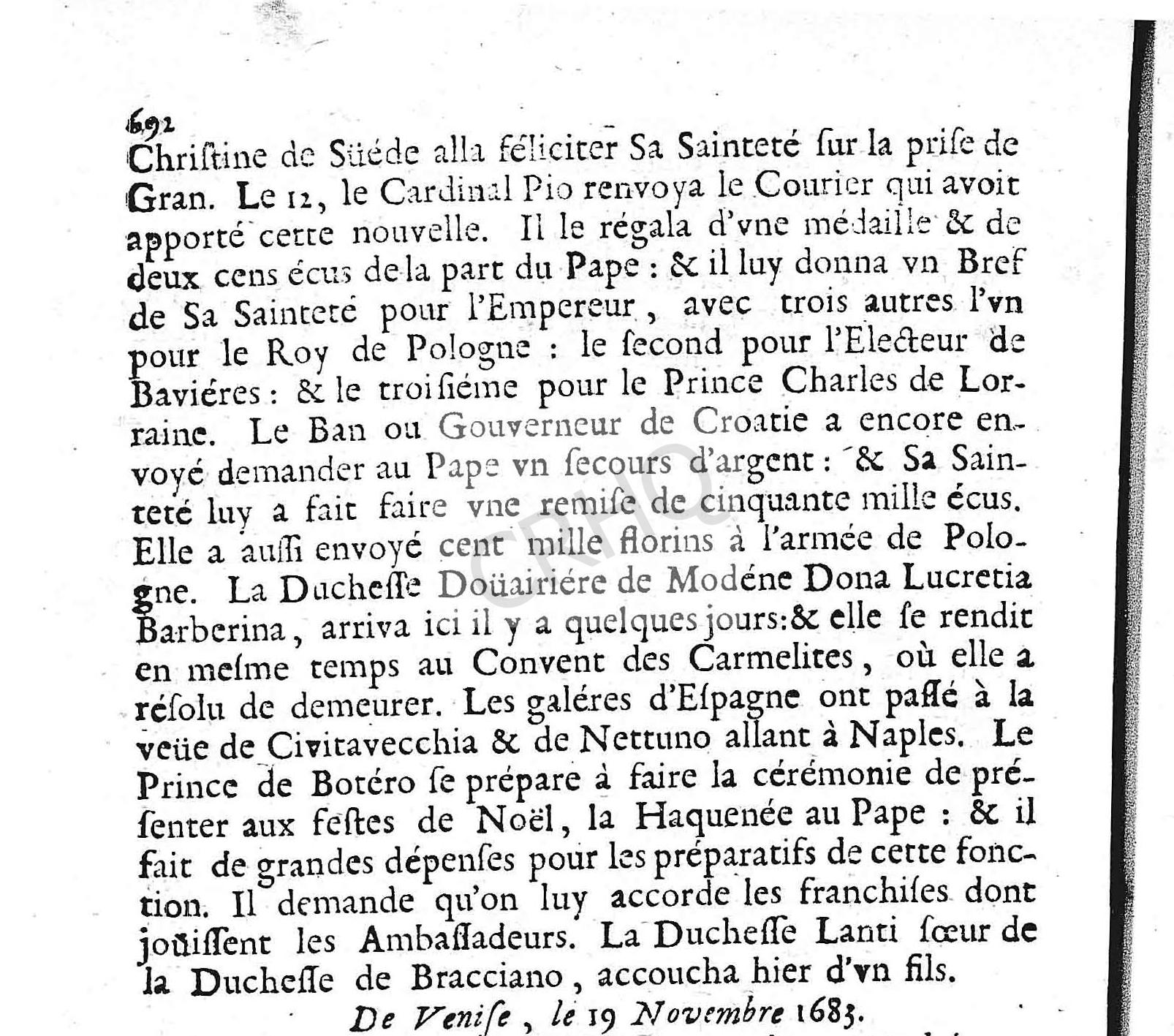 luy a fait faire vne remise de cinquante mille écus. Elle a aussi envoyé cent mille florins à l’armée de Pologne. La Duchesse Doüairiére de Modéne Dona Lucretia Barberina, arriva ici il y a quelques jours : et elle se rendit en mesme temps au Convent des Carmelites, où elle a résolu de demeurer. Les galéres d’Espagne ont passé à la veüe de Civitavecchia et de Nettuno allant à Naples. Le Prince de Botéro se prépare à faire la cérémonie de présenter aux festes de Noël, la Haquenée au