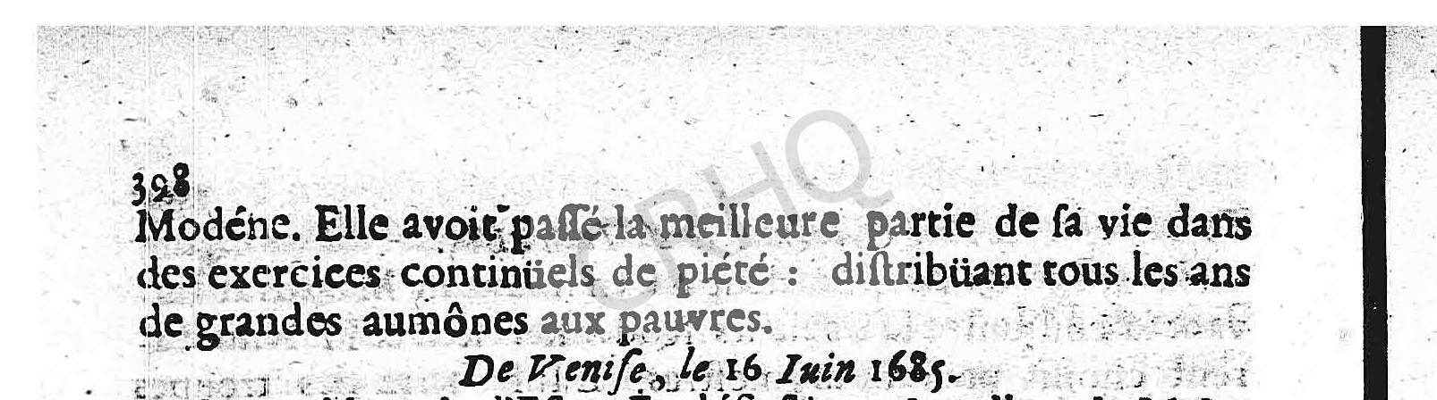 Modéne. Elle avoit passé la meilleure partie de sa vie dans des exercices continüels de piété : distribuant tous les ans de grandes aumônes aux pauvres.