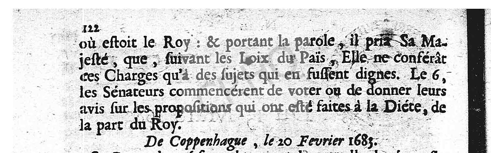 , que, suivant les Loix du Païs, Elle ne conférât ces Charges qu’à des sujets qui en fussent dignes. Le 6, les Sénateurs commencérent de voter ou de donner leurs avis sur les propositions qui ont esté faites à la Diéte, de la part du