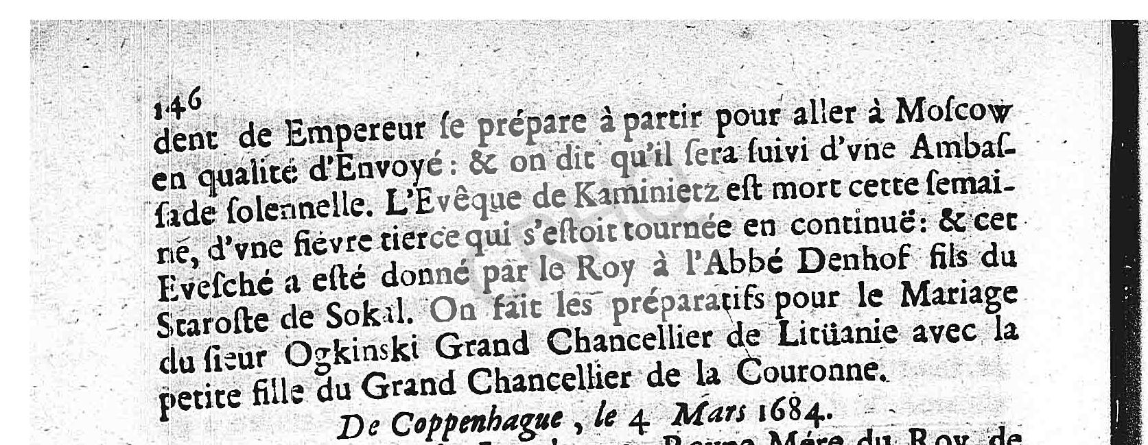 à l’Abbé Denhof fils du Staroste de Sokal. On fait les préparatifs pour le Mariage du sieur Ogkinski Grand Chancellier de Litüanie avec la petite fille du Grand Chancellier de la Couronne.