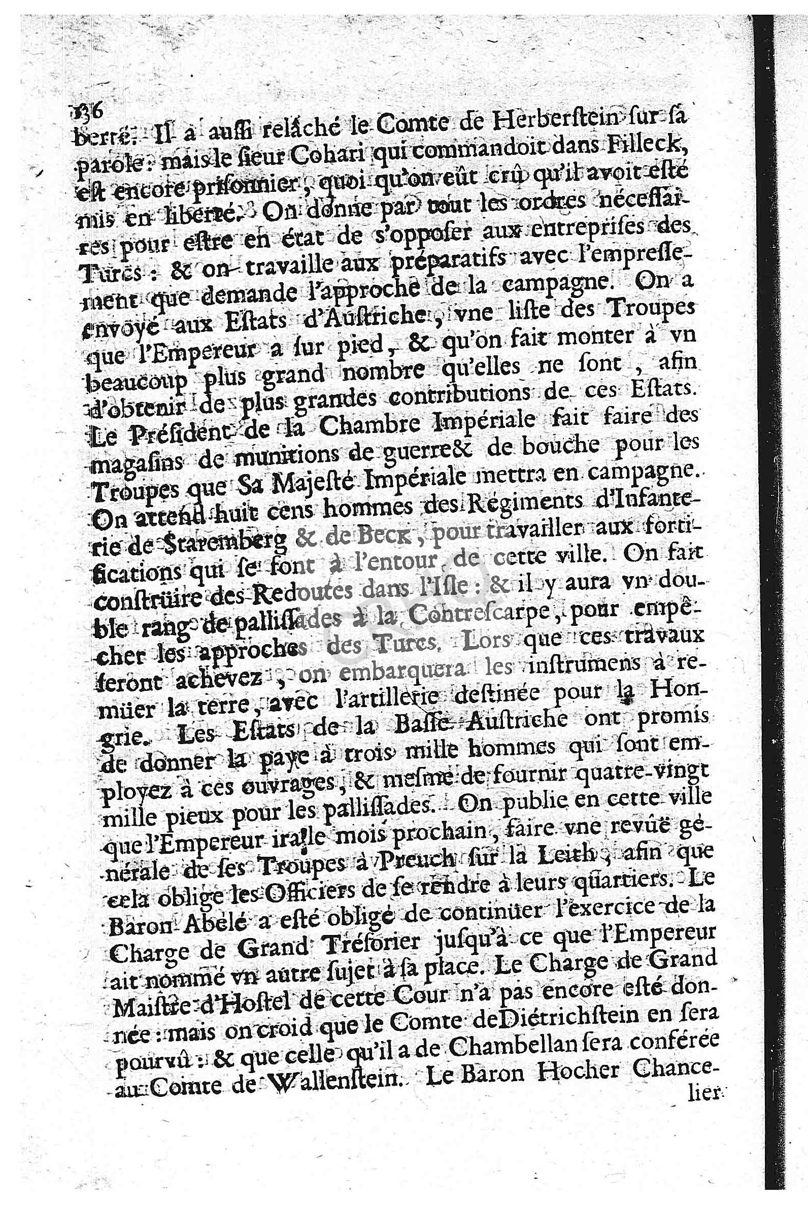 les avoit mis enliberté. Il a aussi relâché le Comte de Herberstein sur sa parole : mais le sieur Cohari qui commandoit dans Filleck, est encore prisonnier, quoi qu’on eût crû qu’il avoit esté mis en liberté. On donne par tout les ordres nécessaires pour estre en état de s’opposer aux entreprises des Turcs : et on travaille aux préparatifs avec l’empressement que demande l’approche de la campagne. On a envoyé aux Estats d’Austriche, vne liste des Troupes que l’