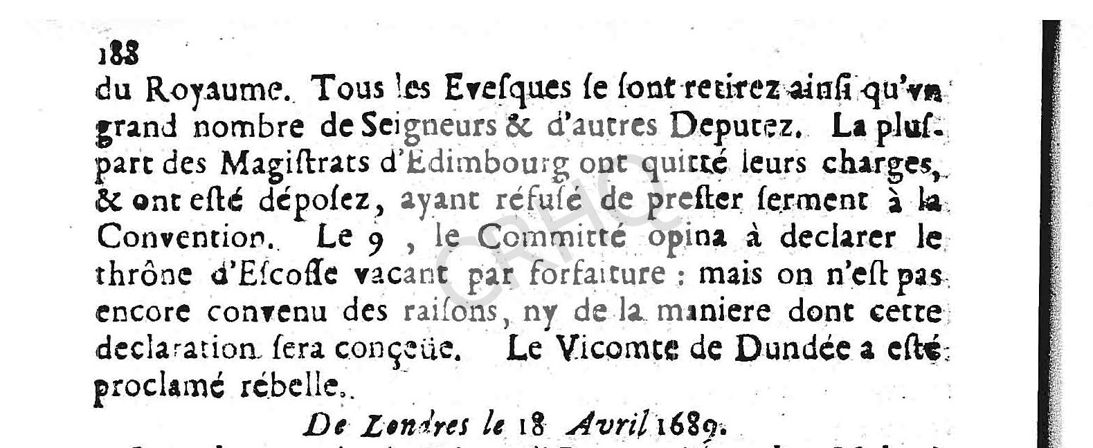 Tous les Evesques se sont retirez ainsi qu’vn grand nombre de Seigneurs et d’autres Deputez. La pluspart des Magistrats d’Edimbourg ont quitté leurs charges, et ont esté déposez, ayant refusé de prester serment à la Convention. Le 9, le Committé opina à declarer le thrône d’Escosse vacant par forfaiture : mais on n’est pas encore convenu des raisons, ny de la maniere dont cette declaration sera conçeüe. Le Vicomte de