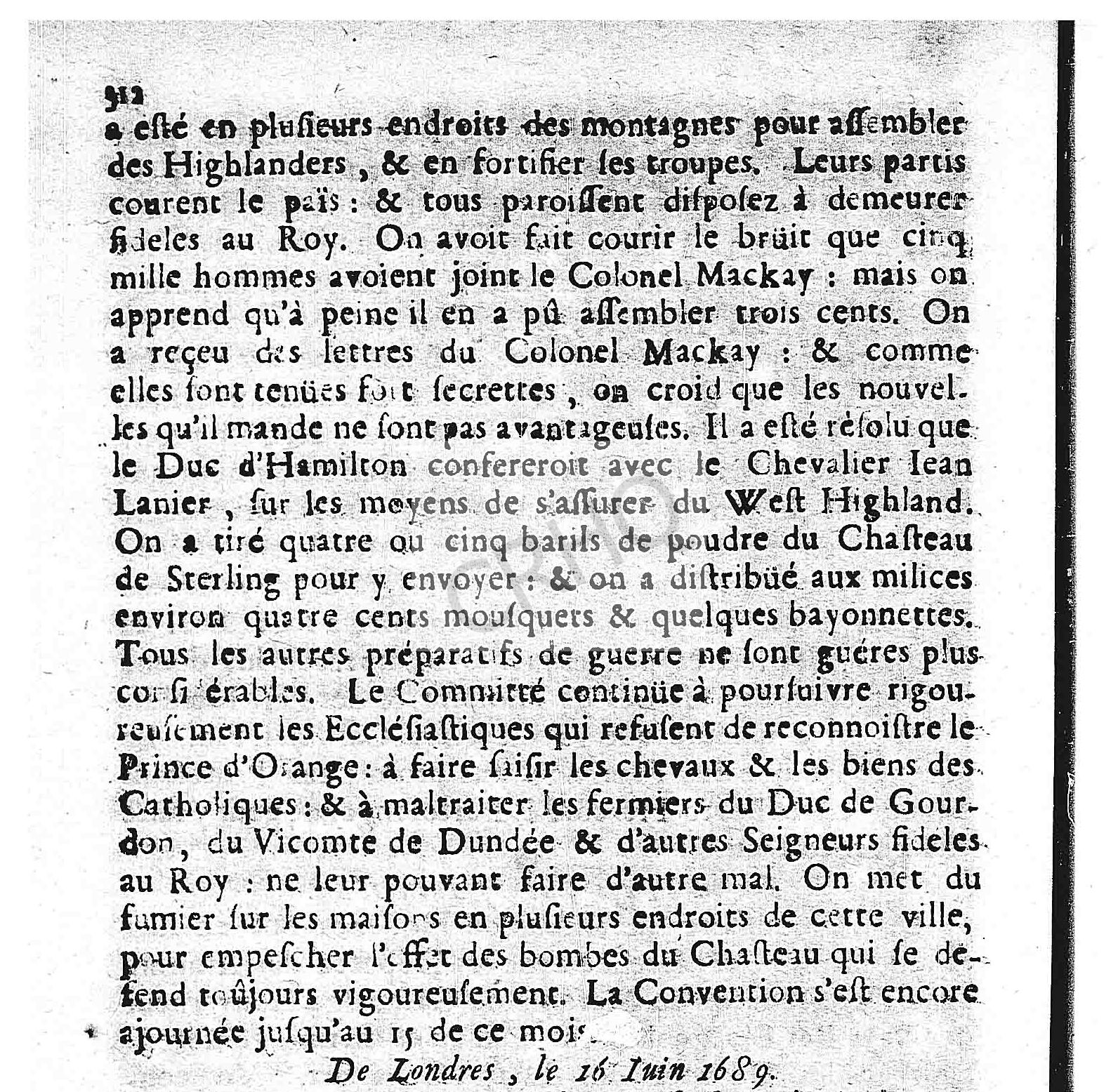 confereroit avec le Chevalier Iean Lanier, sur les moyens de s’assurer du West Highland. On a tiré quatre ou cinq barils de poudre du Chasteau de Sterling pour y envoyer : et on a distribüé aux milices environ quatre cents mousquets et quelques bayonnettes. Tous les autres préparatifs de guerre ne sont guéres plus considérables. Le Committé continüe à poursuivre rigoureusement les Ecclésiastiques qui refusent de reconnoistre le Prince d’Orange : à faire saisir les chevaux et les biens des Catholiques : et à maltraiter les fermiers du Duc de