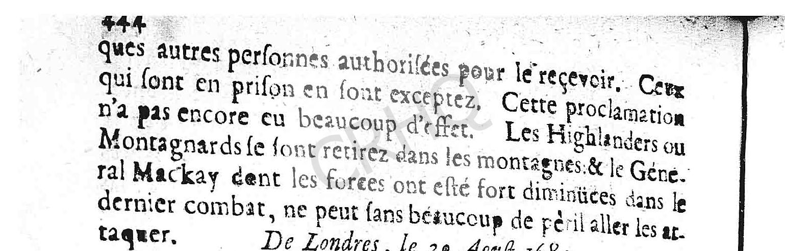des Comtez, leurs Lieutenants, ou quel--ques autres personnes authorisées pour le reçevoir. Ceux qui sont en prison en sont exceptez. Cette proclamation n’a pas encore eu beaucoup d’effet. Les Highlanders ou Montagnards se sont retirez dans les montagnes : et le Général