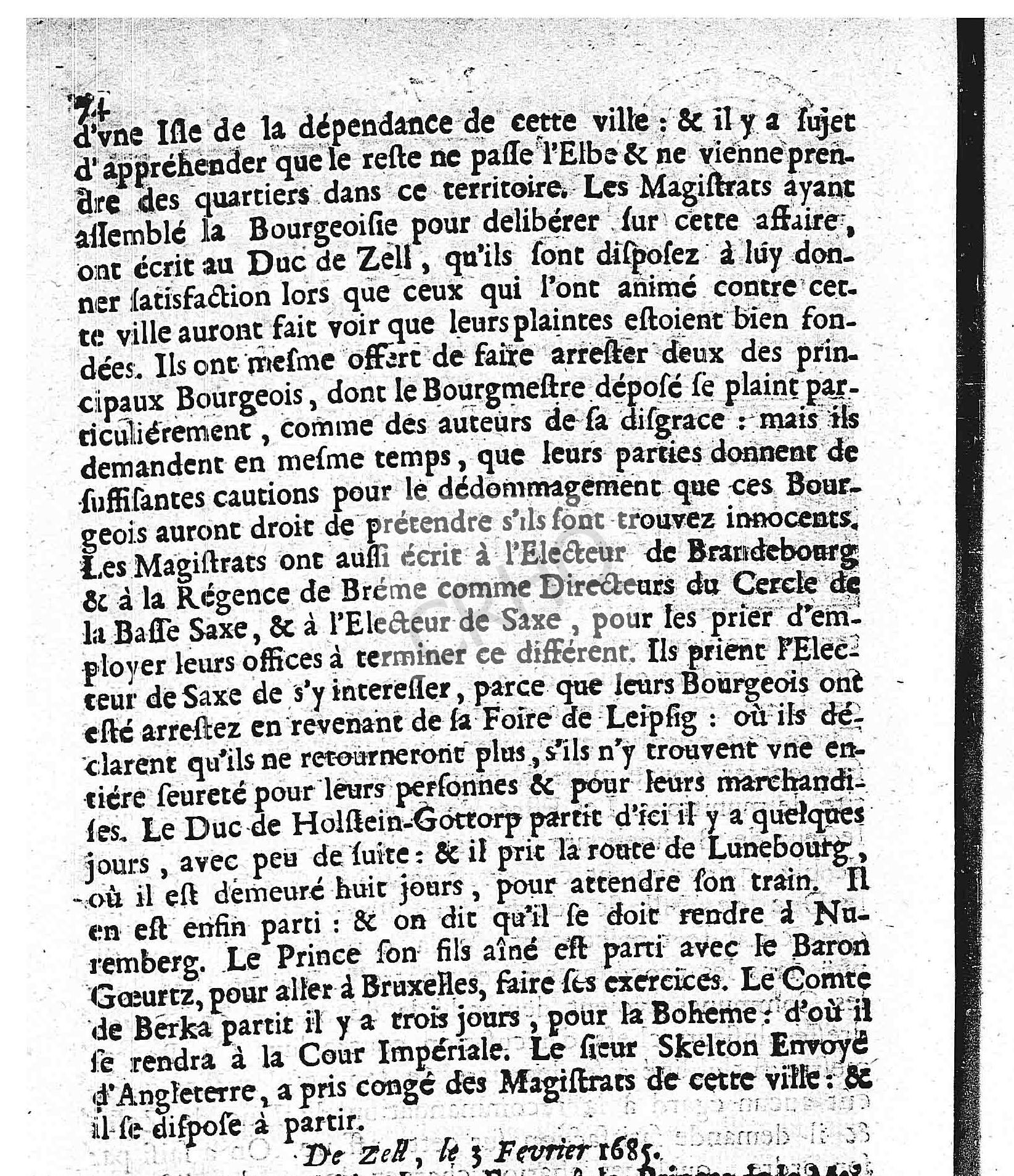 partit d'ici il y a quelques jours, avec peu de fuite : & il prit la route de Lunebourg , où il est demeuré huit jours, pour attendre son train. Il en est enfin parti : & on dit qu'il se doit rendre a Nuremberg. Le Prince son fils aîné est parti avec le Baron Gœurtz, pour aller à Bruxelles, faire ses exercices. Le Comte de Berka partit il y a trois jours , pour la Boheme : d’où il se rendra à la Cour Impériale. Le sieur Skelton Envoyé d'Angleterre , a pris congé dés Magistrats de cette ville : & il se dispose à partir.
