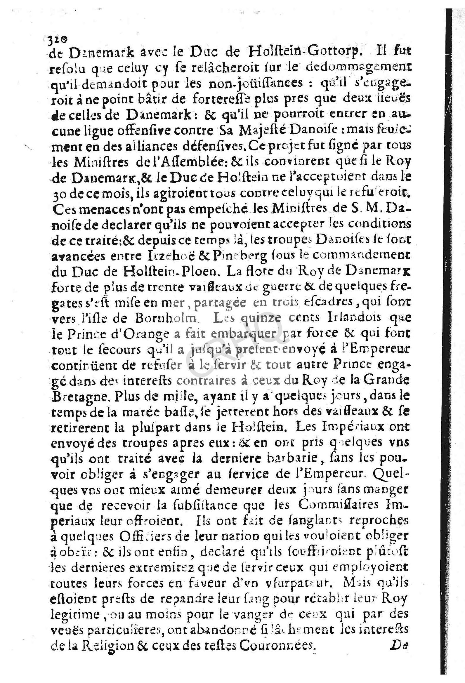 de declarer qu’ils ne pouvoient accepter les conditions de ce traité : et depuis ce temps là, les troupes Danoises se sont avancées entre Irzehoë et Pineberg sous le commandement du Duc de Holstein-Ploen. La flote du