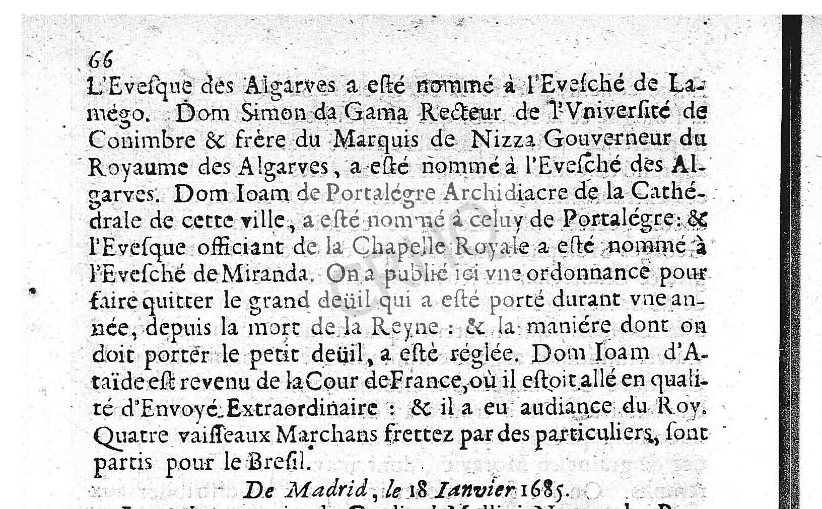 L'Evesque des Algarves a esté nommé à l'Evesché de Lamégo. Dom Simon da Gama Recteur de l’Université de Conimbre & frère du Marquis de Nizza Gouverneur du Royaume des Algarves , a eue nommé à l'Evesché des Algarves. Dom Joam de Portalégre Archidiacre de la Cathédrale de cette ville, a esté nommé à celuy de Portalégre & l'Evesque officiant de la Chapelle Royale a esté nommé à l'Evesché de Miranda. On a publié ici une ordonnance pour faire quitter le grand deuil qui a esté porté durant une année, depuis la mort de la Reyne & la maniére dont on doit porter le petit deüil, a esté réglée. Dom Joam d'Ataïde est revenu de la Cour de France, où il estoit allé en qualité d'Envoyé Extraordinaire : & il a eu audiance du