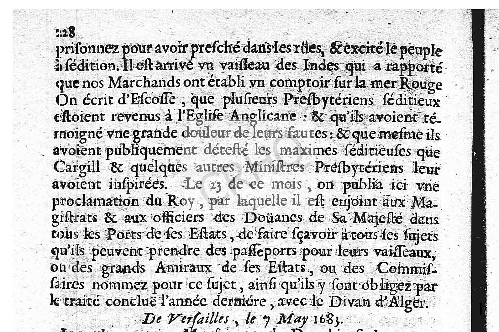 . Il est arrivé vn vaisseau des Indes qui a rapporté que nos Marchands ont établi vn comptoir sur la mer Rouge. On écrit d’Escosse, que plusieurs Presbytériens séditieux estoient revenus à l’Eglise Anglicane : et qu’ils avoient témoigné vne grande douleur de leurs fautes : et que mesme ils avoient publiquement