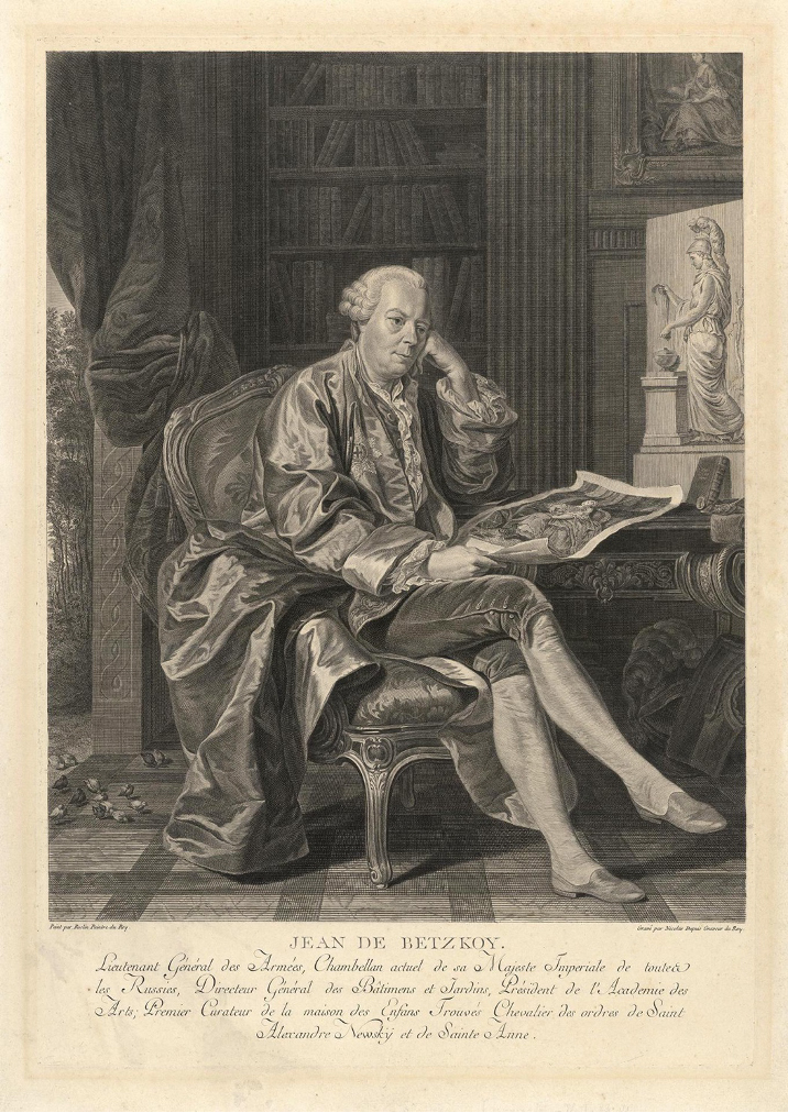 Si Betskoï est resté plutôt discret pendant la première partie de sa vie, c’est sous le règne de Catherine II qu’il devient un homme central au sein de l’Empire. Il passe pour un visionnaire auprès de l’impératrice, qui l’apprécie particulièrement40. Au xviiie siècle, dans toute l’Europe, l’éducation est l’une des préoccupations centrales des dirigeants. Betskoï, comme certains de ses contemporains, attribue le retard de la Russie dans le domaine éducatif à l’absence d’une véritable classe moyenne41. Il rédige alors Les Plans et les Statuts des différents établissements ordonnés par Sa Majesté Catherine II42, où il propose de rompre avec la tradition russe, qui réserve l’éducation à l’élite, pour l’ouvrir à presque toutes les classes sociales43. Ses plans pour l’éducation, fortement inspirés par les idées de Locke et de Rousseau ainsi que par ses rencontres parisiennes, demeurent trop ambitieux pour la Russie de la seconde moitié du xviiie siècle44. Toutefois, ses idées ne sont pas rejetées en bloc. L’enthousiasme de Betskoï, allié au soutien de l’Impératrice, permettent entre autres à la Russie de rapidement se doter de deux Maisons des enfants trouvés, d’un institut pour jeunes filles (Institut Smolny), ainsi que de plusieurs écoles à travers l’empire45. À côté de cela, il réorganise l’Académie des beaux-arts, fondée par Ivan Chouvalov et l’impératrice Élisabeth en 1757, dont il définit les premiers privilèges et règlements.