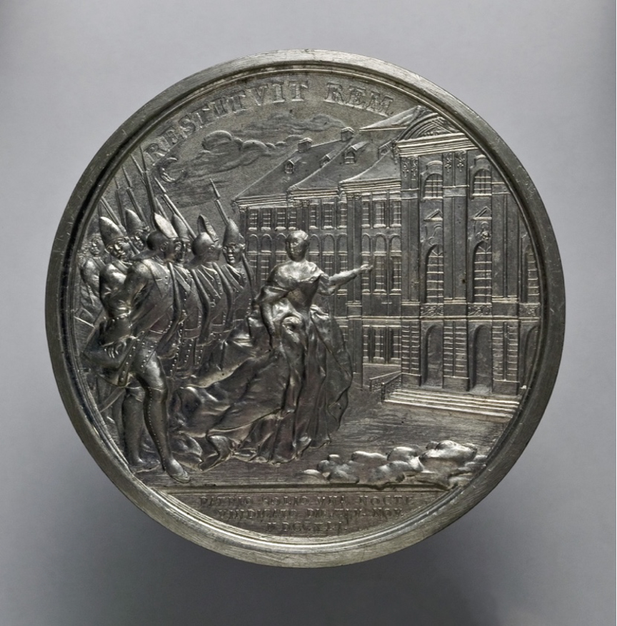 Les représentations du coup d’État demeurent assez rares. Il n’est pas connu de gravure ou peinture sur ce sujet du temps du règne d’Élisabeth. Deux éditions de médailles, celle exécutée par Dubut et une autre datant de 1761 d’après des dessins de Georg Christian Waechter (1729-1789) [fig. 4]53, commémorant les 20 ans du règne, et la stèle de Pajou semblent composer l’intégralité du corpus connu. Cependant, les règnes qui se succèdent en Russie au cours du xviiie siècle sont profondément marqués par des prises violentes et soudaines de pouvoir. De multiples ruptures dans la continuité dynastique, entre 1724 et 1762, ont fait connaître cette époque comme « l’ère des révolutions de palais »54. L’historien Igor Kouroukin montre que le peuple russe n’est presque jamais impliqué dans ces prises de pouvoir, la Garde étant le protagoniste, alliée à des émissaires étrangers, ainsi qu’à une partie de la noblesse, et au futur monarque qui orchestre le tout55. Le changement de monarque n’a que peu d’impact direct sur le peuple en lui-même. Pour cette période, les auteurs russes n’emploient d’ailleurs pas le terme de « coup d’État », comme c’est le cas en Occident, mais parlent de « coup de Palais »56, en montrant que celui-ci n’affecte véritablement pas l’administration ou/et la population. Pour l’historien Evgenij Anisimov, tous les coups d’État (de Palais) du xviiie siècle, avec la participation de la Garde, se ressemblent, mais chacun a néanmoins sa propre teinte, sa propre particularité57. Ainsi, si les « coups de Palais » ne laissent pas un grand nombre de représentations picturales ou sculptées, ils n’en demeurent pas moins des actes particulièrement importants dans l’histoire de la Russie impériale, et font partie intégrante de la politique culturelle des nouveaux monarques.