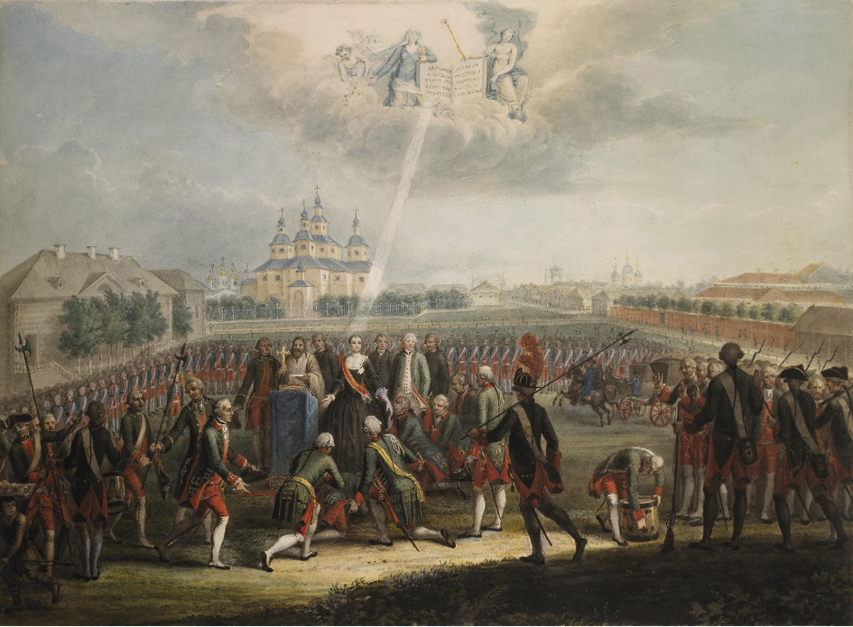 86L’ordre de la série : 1 – Départ de Catherine II de Peterhof, 2 – Procession de Catherine II le long de la route de Peterhof, 3 – Le serment du régiment de la Garde Izmailovsky, 4 – Catherine II accueillie par les membres du clergé sur le parvis de la cathédrale Notre-Dame de Kazan le jour de son avènement, 5 – Catherine II acclamée par les troupes et le peuple au balcon du palais d’Hiver le jour de son avènement.