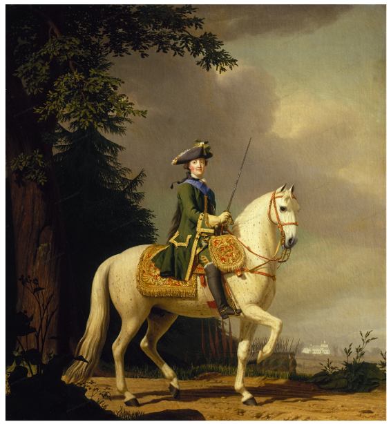 97Contrairement à une œuvre de jeunesse où Catherine II, alors Grande-Duchesse, est représentée par Grooth en amazone. Georg Christoph Grooth, La Grande-Duchesse Catherine Alekeïevna à cheval, Saint-Pétersbourg, Musée d’État russe, vers 1744.