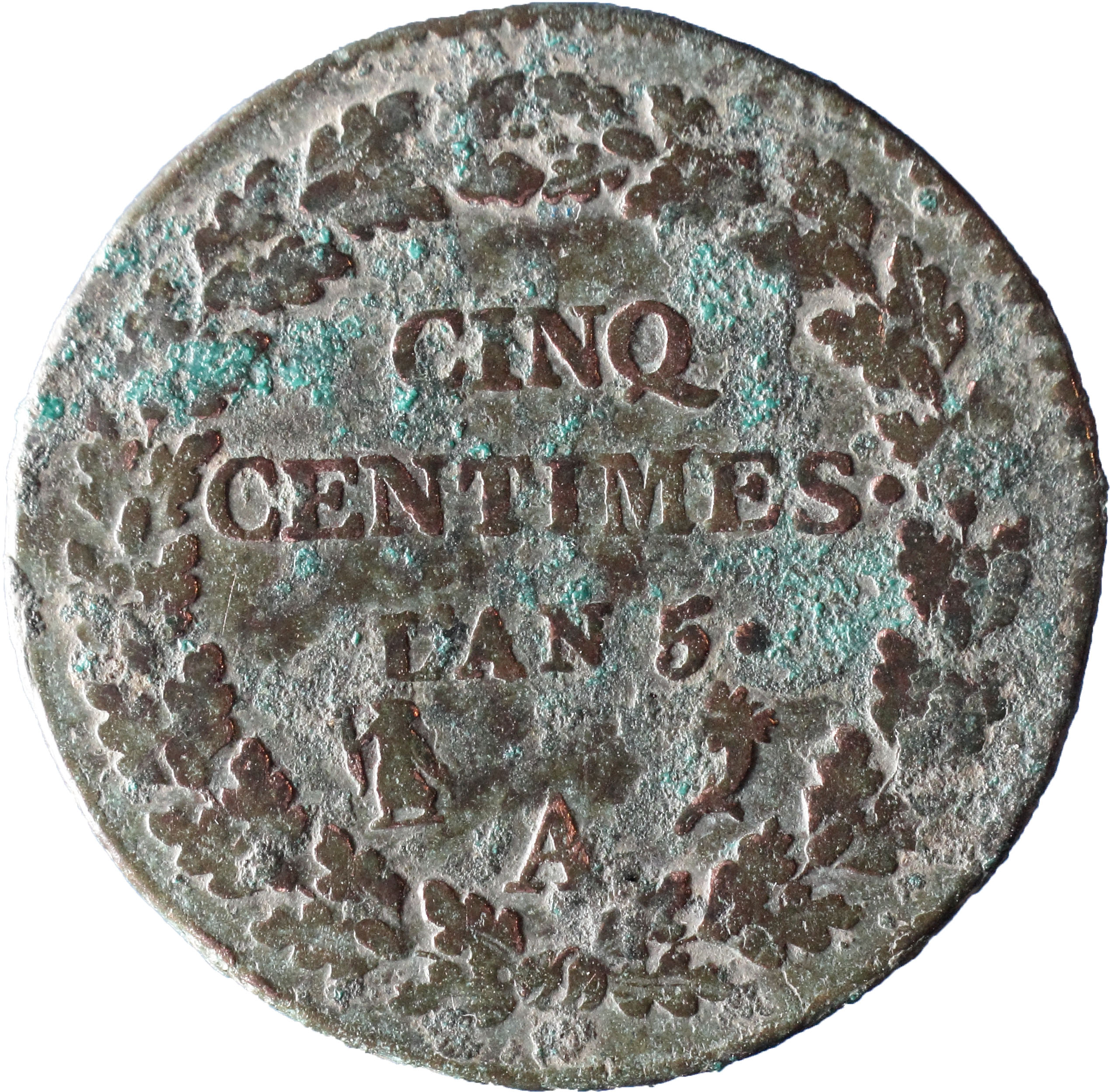 • en deux lignes dans le champ, au-dessus L’AN 5 suivi d'un point et de la lettre d'atelier A encadrés des différents, dans une couronne fermée composée de deux branches de chêne opposées nouées à leur base par un ruban.